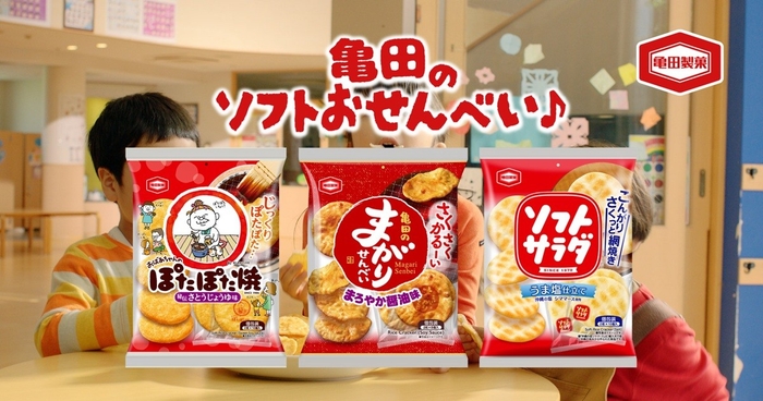 亀田製菓株式会社(本社:新潟県新潟市、代表取締役社長 COO:髙木 政紀)は、サクサクとした食感が特徴で三世代に愛されているロングセラー商品『ぽたぽた焼』『亀田のまがりせんべい』『ソフトサラダ』の新CMを制作、夏休みに合わせて7月21日(月)より全国にて順次放送を開始します。CMでは、亀田製菓のサウンドロゴ「亀田のあられ♪おせんべい♪」を活かしたオリジナルソングに合わせて、子どもたちが元気いっぱいおせんべいを頬張ります。商品のおいしさの秘訣を盛り込んだ歌詞にも注目です。