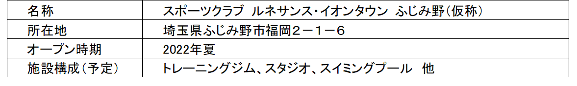 株式会社ルネサンス(本社:東京都墨田区、代表取締役社長執行役員:岡本利治、以下「当社」)は、「スポーツクラブ ルネサンス・イオンタウン ふじみ野(仮称)」を2022年夏に出店することといたしましたので、以下の通りお知らせいたします。