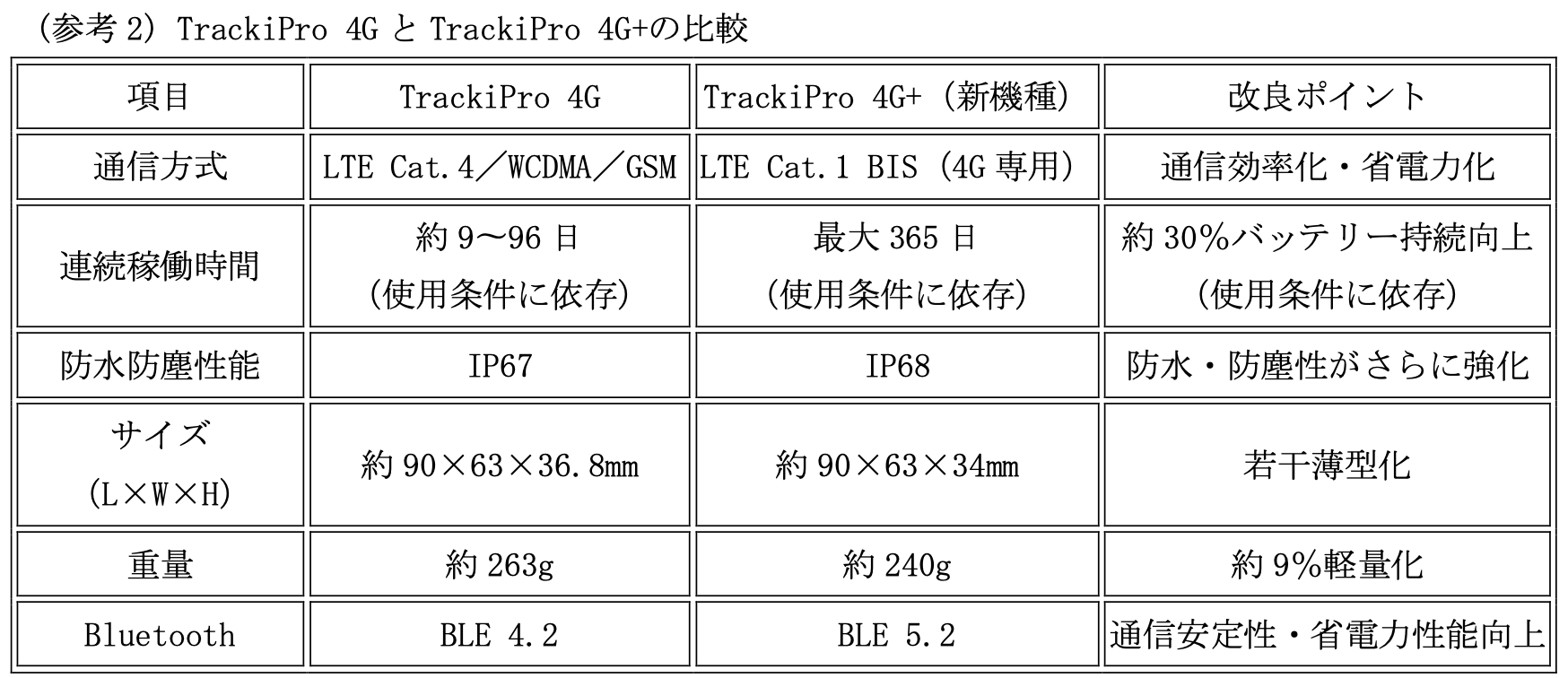本製品は、従来モデル「TrackiPro 4G」で高く評価された大容量バッテリーと追跡性能を継承しつつ、通信方式と構造設計を刷新することで、小型・軽量化と、省電力化、防水防塵性を強化した後継機種です。