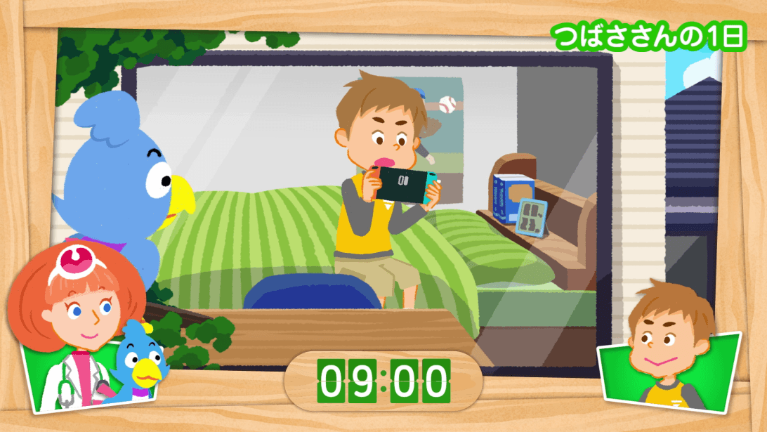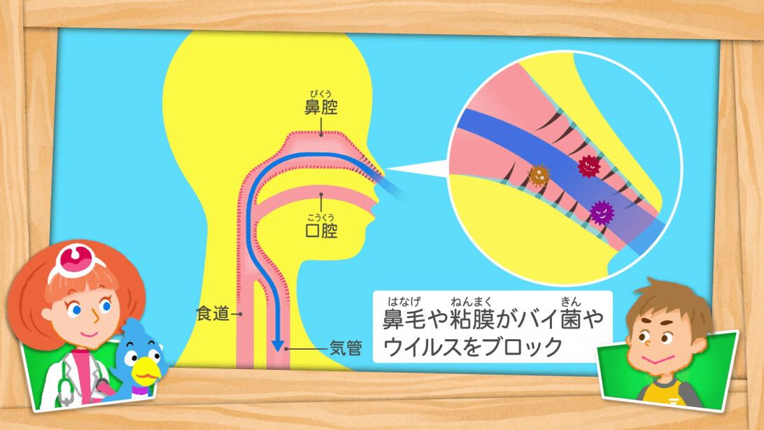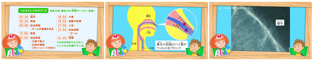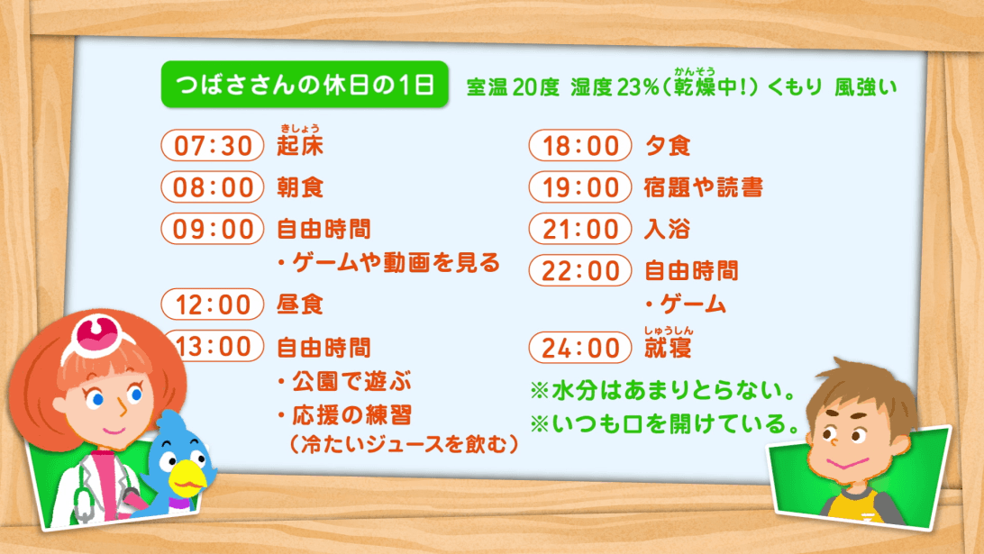つばさがのどの不調を伝えると、ノードン先生はつばさの1日の過ごし方を尋ねます。つばさは、乾燥した部屋で過ごしていたり、大声を出す応援団の練習中に冷たいジュースばかり飲んで、こまめな水分補給をしていなかったり、口を開けたまま寝ていたそうです。しかし、つばさはのどに悪いことをしてしまった自覚がまるでありません。「のどに悪いこと、たくさんしているよ!」と話すボーチェ。一体、どんなことがのどにとって良くなかったのでしょうか。(ワークシート活用)