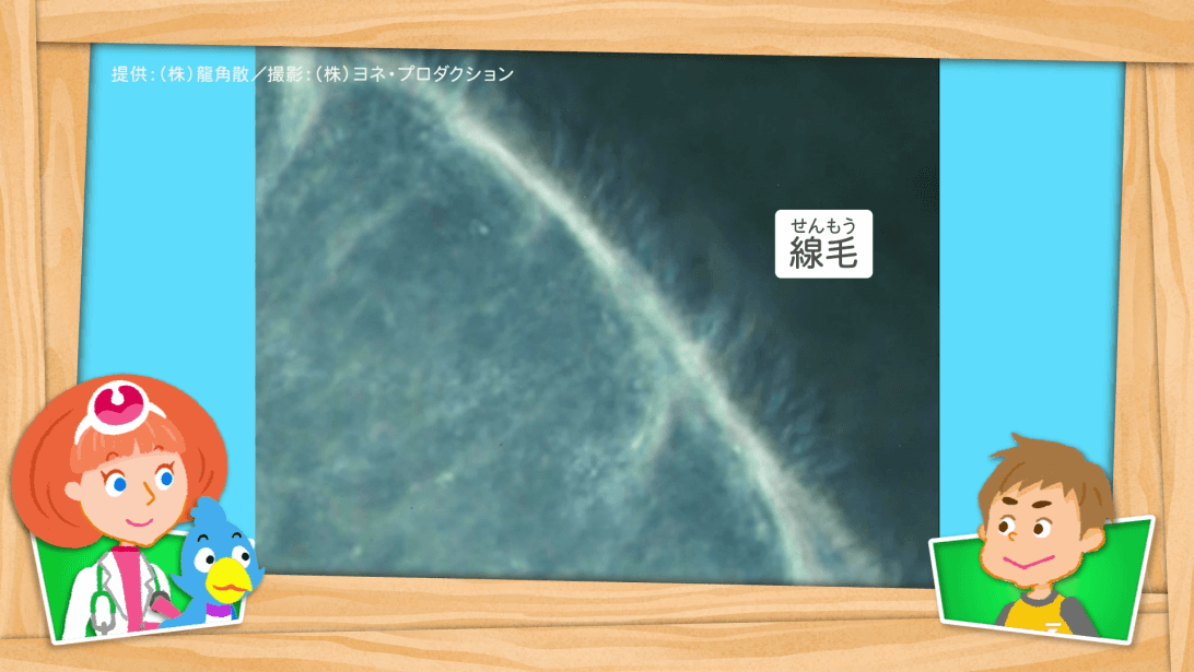 ノードン先生はつばさの1日を振り返って、のどの調子が悪くなってしまった理由について、「口呼吸」「水分をあまりとらない」「乾燥した場所にずっといる」「のどを冷やす」「大声を出す」「生活リズム」の6つの原因があると語ります。顕微鏡をのぞきながら、のどのしくみやのどに悪い生活習慣について詳しく説明するノードン先生。のどに優しい生活の仕方を、一緒に考えます。(ワークシート活用)