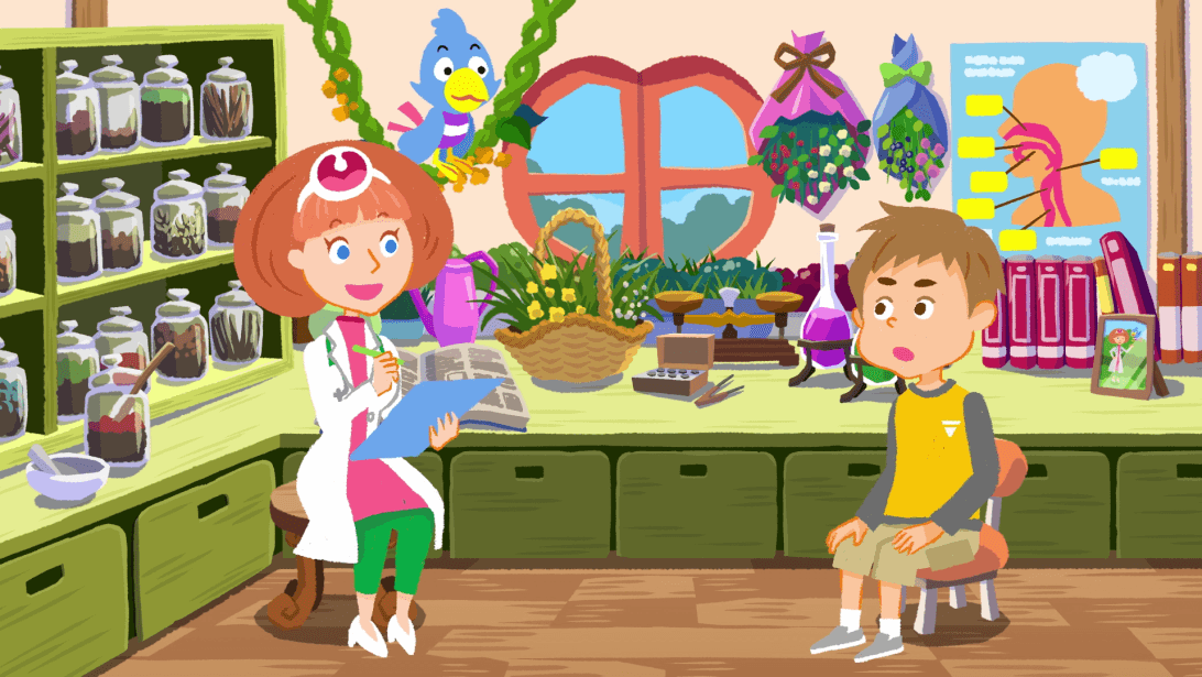 とびっきり元気な、小学6年生のつばさ。ある日、つばさがのどに違和感を感じていると、小鳥のボーチェが現れ、つばさを森の中にある診察室に案内します。到着すると、そこにはのど専門のお医者さんノードン先生がいました。ノードン先生はつばさを歓迎して、リズミカルな歌をうたいます。