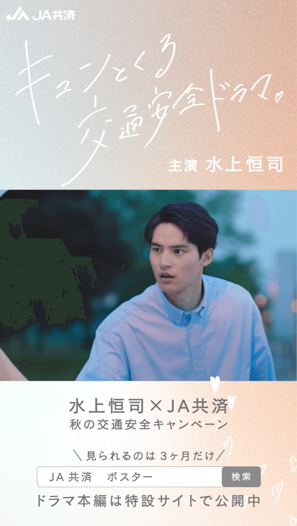 “相手を思う気持ちが、交通安全につながる。” 「水上 恒司×JA共済 秋の交通安全キャンペーン」実施! 水上恒司、年上女性との恋模様を熱演! 相手への思いやりが溢れる「キュンとくる交通安全ドラマ」 全3話を順次公開!交通安全を新たな視点でお届け。 特別インタビュー・オフショット映像も!理想の初デートや事故に遭った経験語る