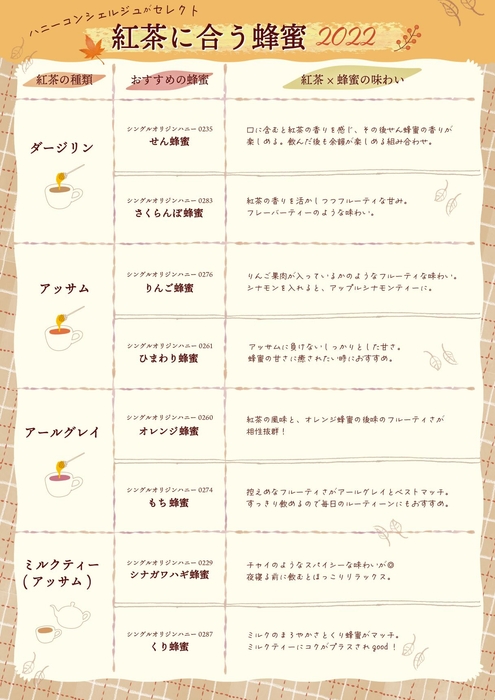 紅茶に合う蜂蜜リストは、同社が運営する蜂蜜専門店ミールミィ・クリームパン専門店キンイロ各店にて、期間限定で配布するほか、ミールミィ三条本店ハニーカフェでは、お代わり自由の紅茶に10種類の蜂蜜がかけ放題のハニースイーツセットも提供中。きっとお気に入りの素敵なペアリングが見つかるはずです。
