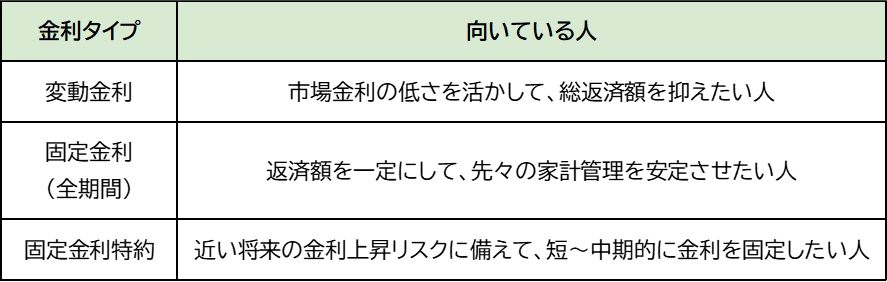 自分のライフスタイルや金利上昇リスクへの考え方に合わせて選択するのがポイントです。