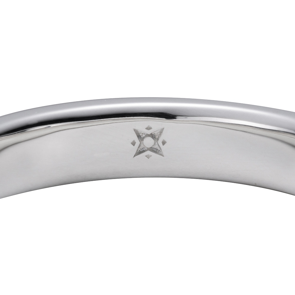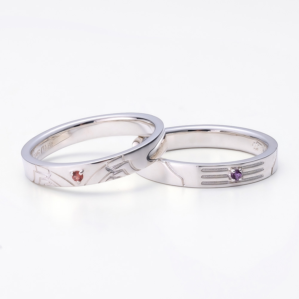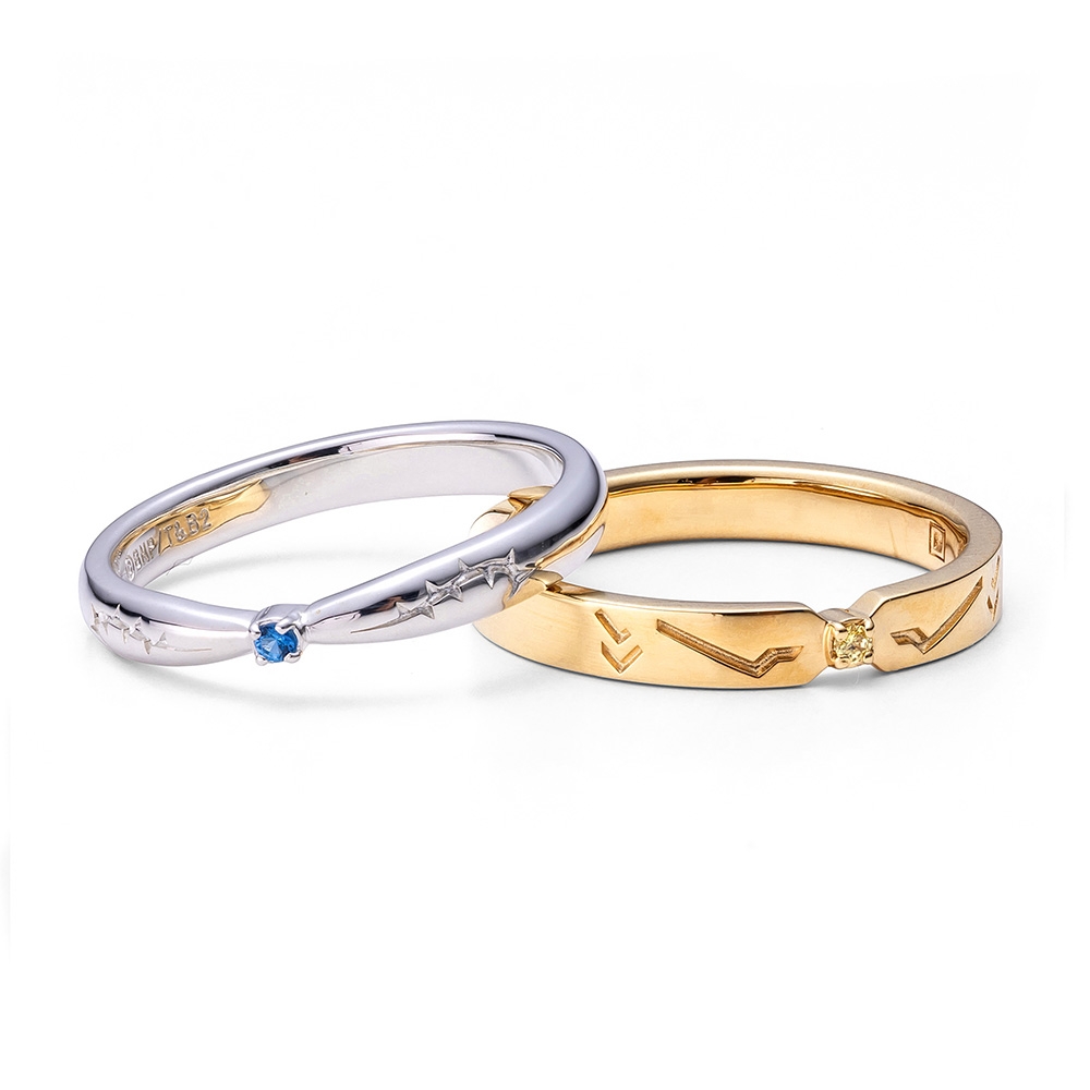 背中の手裏剣モチーフを取り込んだ段差のある平打ちフォルムの表面に、イメージカラーストーンをセット。内側には手裏剣の形を刻印しました。
