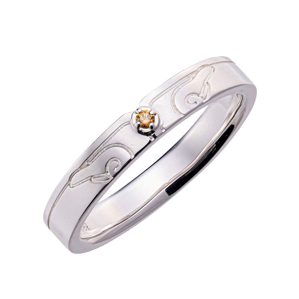 頭の角モチーフを取り込んだ段差のある平打ちフォルムの表面に、イメージカラーストーンをセット。内側にはハットの形を刻印しました。