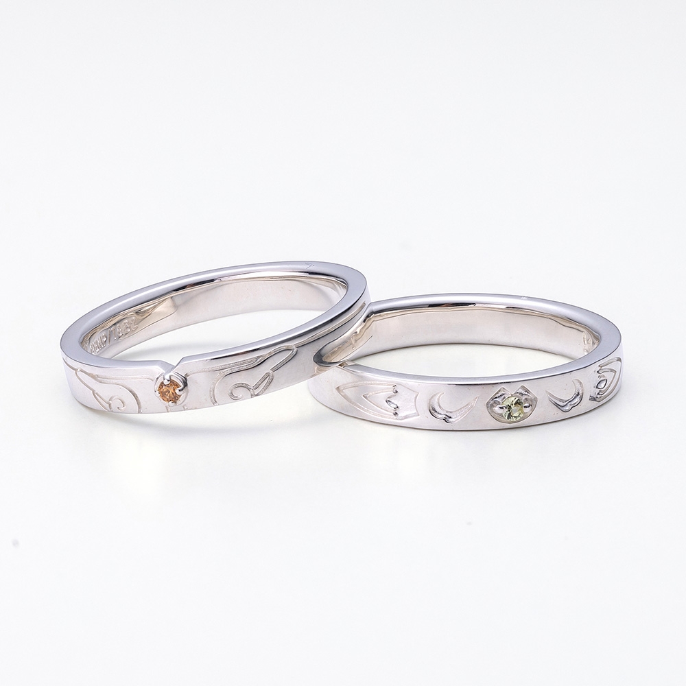 スーツの胸元の模様を取り込んだなめらかな平打ちフォルムの表面にイメージカラーストーンをセット。内側にはジョンとジョンジョンの足跡の形を刻印しました。