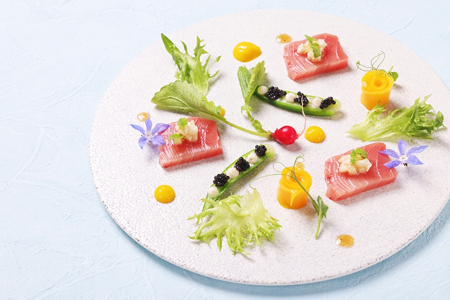 4Fのレストラン「アトリエ」では、『旬の味覚で旅をする』をテーマに「津久見産マグロ」や「佐賀関産イサキ」 など、各地の旬の食材をふんだんに盛り込んだ豪華なラインナップをソムリエが厳選した多彩なワインセレクション の中から、お料理に最良の1銘柄をグラスで提供するワインペアリングとともにお楽しみいただけます。