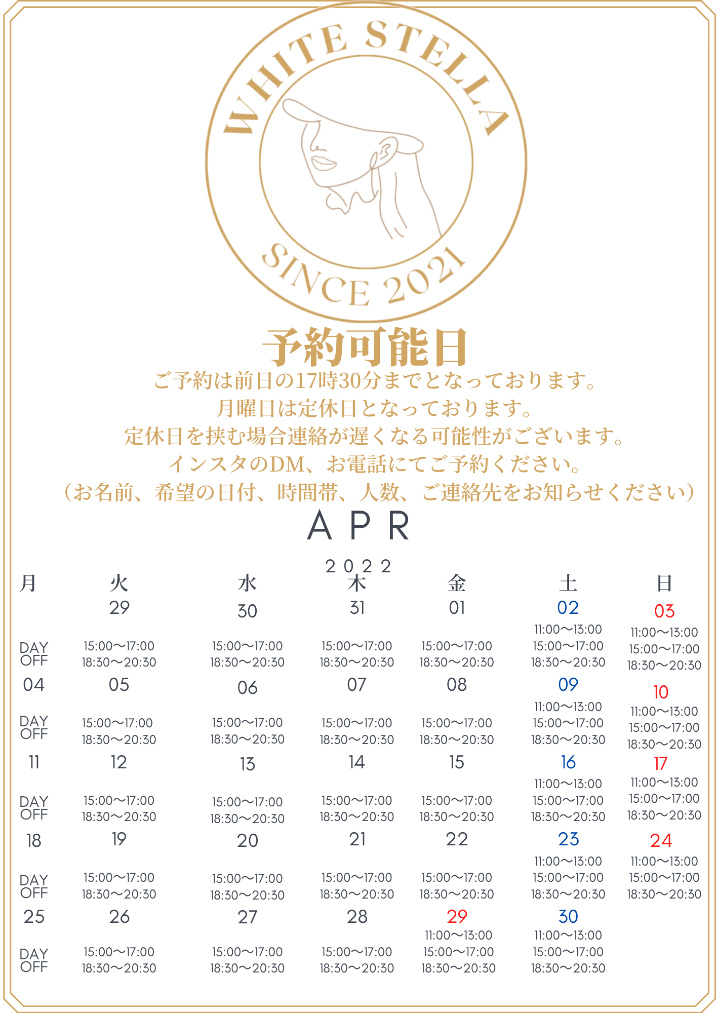 また、アフタヌーンティーの好評や、まん延防止の緩和等に伴い、今まで月曜日と木曜日が定休日でしたが木曜日も通常営業を再開します!前回よりも予約の枠を多くしていますので是非ご連絡してください!