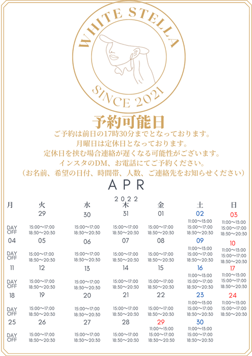 10:00~17:30(※ご予約は3日前までにお願い致します。)