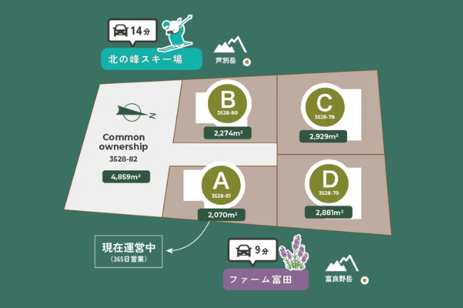北の峰スキー場へは車で14分、ファーム富田へは車で9分と、富良野エリアの二大レジャースポットへのアクセス抜群。