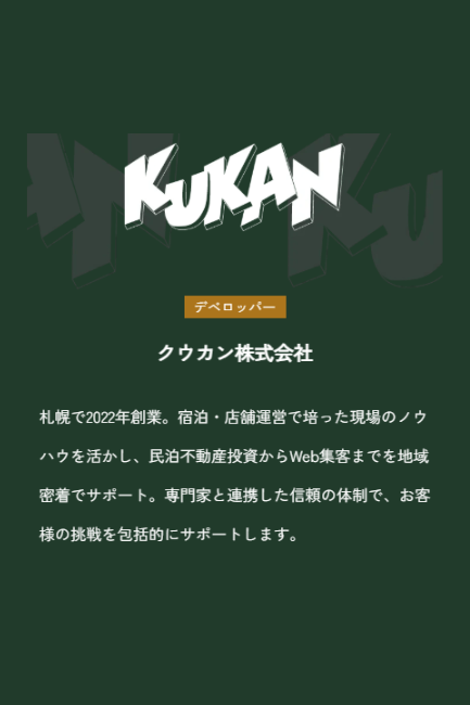 クウカン株式会社(当社)は、2022年の創業以来、倶知安・ニセコエリア、富良野エリアといった北海道のリゾートエリアにて、民泊運営事業や不動産売買事業に取り組んできました。また、2024年には札幌にて冷凍スイーツショップの運営を開始し、集客を狙ったSNS運用ノウハウの獲得にも独自に成功しています。