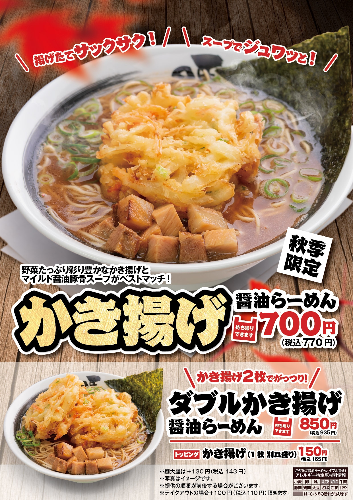 ばり嗎 秋季限定メニュー「かき揚げ醤油らーめん」を9月18日から販売開始