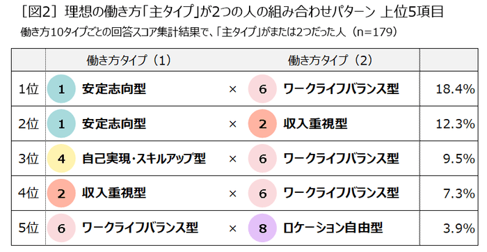 理想の働き方の主タイプが2つの場合、最多の組み合わせは「ワークライフバランス型」×「安定志向型」