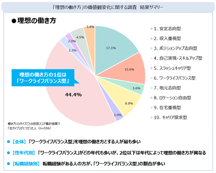 4割以上が「ワークライフバランス型」を理想の働き方とする。2位は「安定志向型」