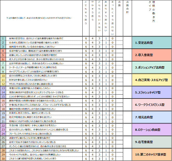 以下の表の設問1~30について「とてもそう思う~まったくそう思わない」の5段階で評価し、タイプごとに点数を合計してください。最も高得点となったタイプが、あなたの「理想の働き方」の「主タイプ」となります。ぜひご自身の「理想の働き方」タイプ診断にご活用ください。