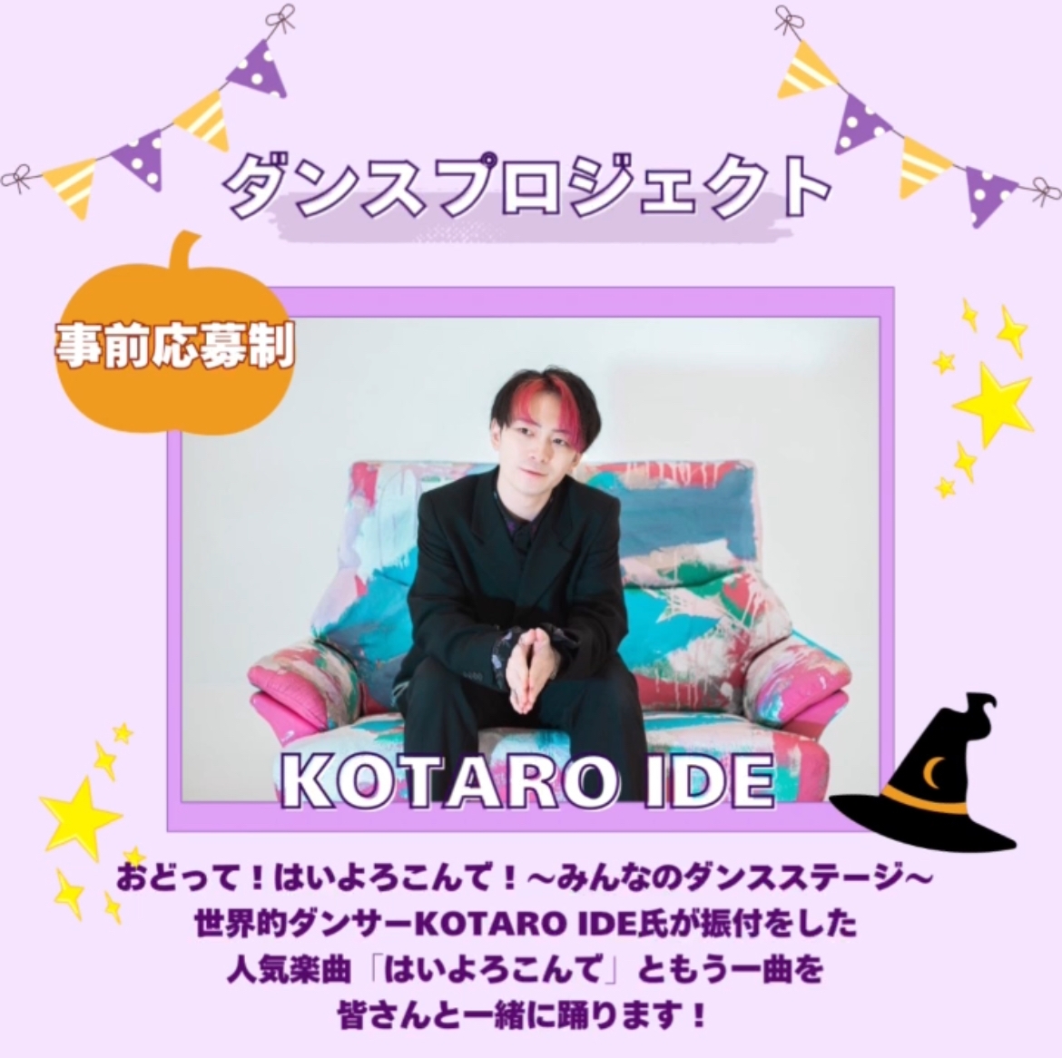 SNS総フォロワー数300万人を誇る世界的ダンサーKOTARO IDE氏による参加型ダンスプロジェクトを行います!KOTARO IDE氏が振付を担当し、TikTokで社会現象となった、こっちのけんと氏のヒット曲「はいよろこんで」を会場の皆さんと一緒に踊ります。さらに、当日はもう一曲(話題の楽曲のサビ部分)も加えて、会場全体でダンスパフォーマンスを披露します。世界的ダンサーとの共演というここだけの体験を通して、性別や年齢、ダンス教室などの枠を超え、子どもから大人まで笑顔で楽しめる一体感あふれる場を創出します。そして、地域の子どもたちにとって忘れられない体験を提供します。一緒に踊る様子は映像として記録する予定です。