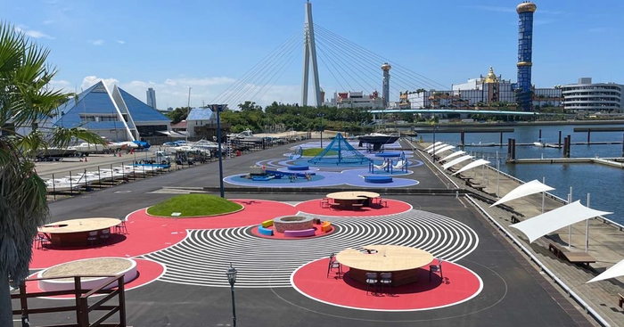 大阪北港マリーナ内にあるアップサイクルをテーマにして自由な発想で遊び、海辺の環境から未来への想像力を育む公園。 船のマストに登る気分で高さを楽しめるネット、体にいい菌が混ぜ込まれた砂場と、遊んだ後にしっかりと手を洗う設備、大人と子どもの隔てなく、みんなで過ごせるビッグテーブルや、海のそばでリラックスしながら、 体と心を休めるベンチやハンモックなど、ワクワクする遊具がたくさん!