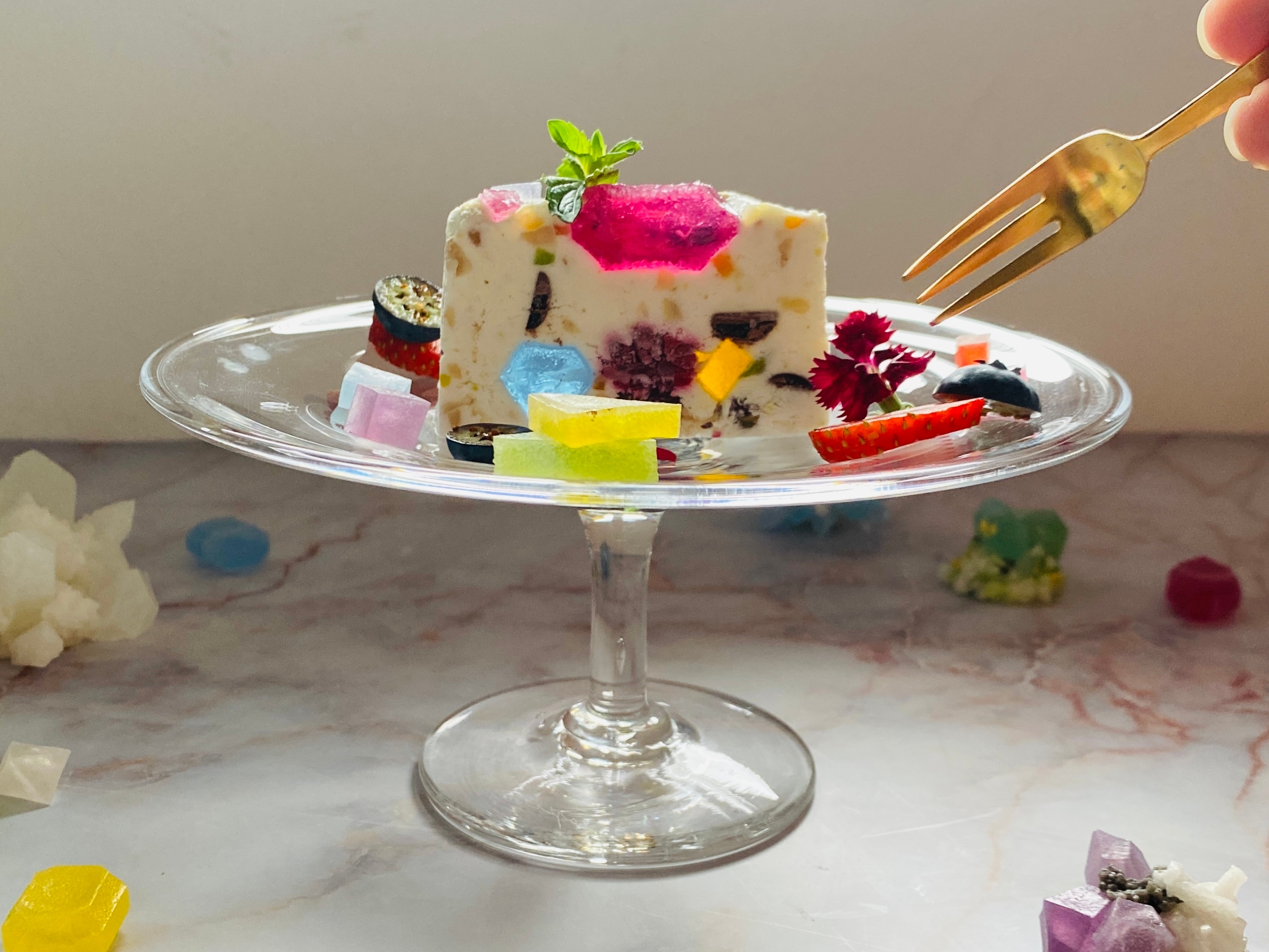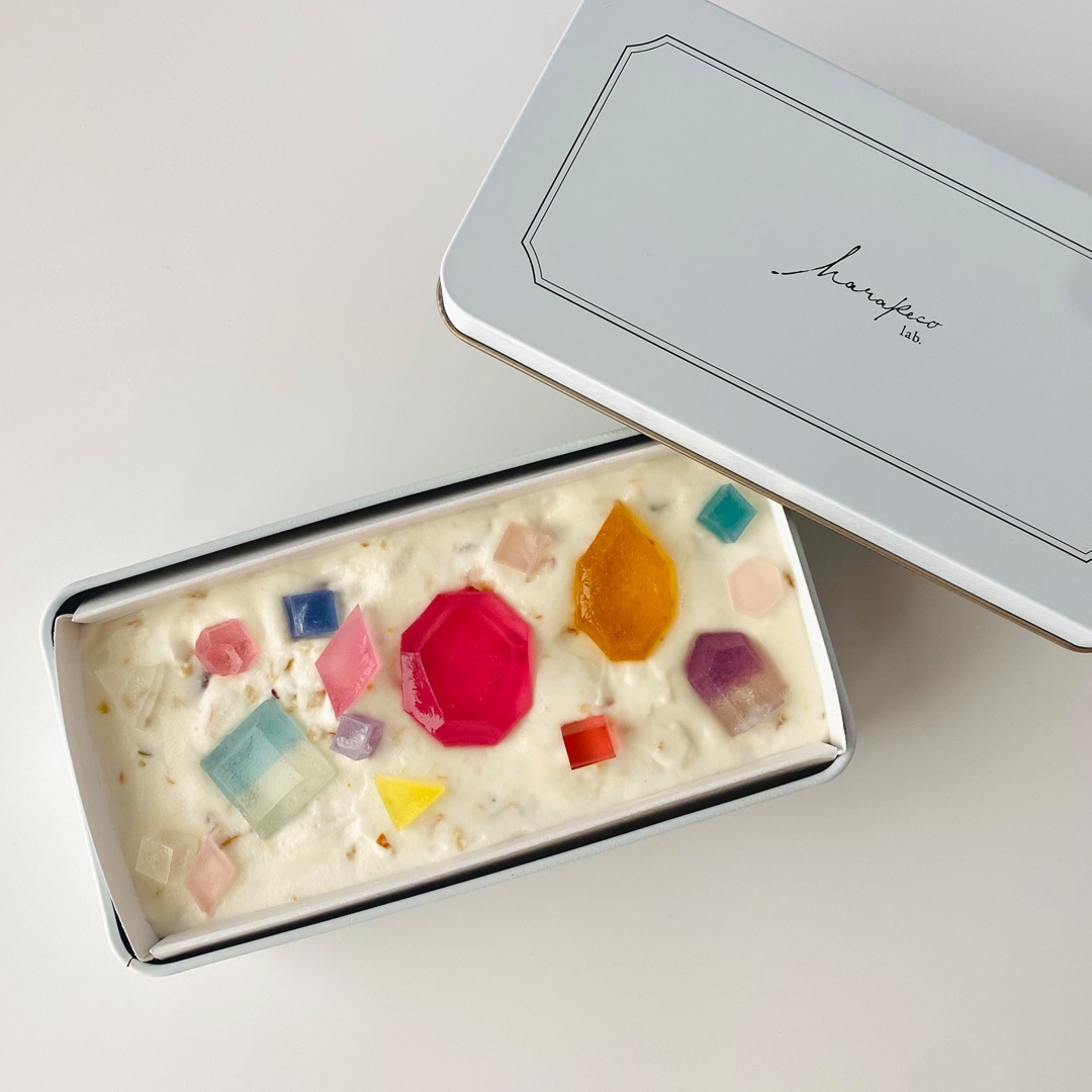 色とりどりで目にも鮮やか、一粒一粒違う味が楽しい琥珀糖「こうぶつヲカシ」をクリームの中にたっぷりととじ込めて、表面には本物の宝石に見立ててカットしたものを贅沢にトッピングしています。