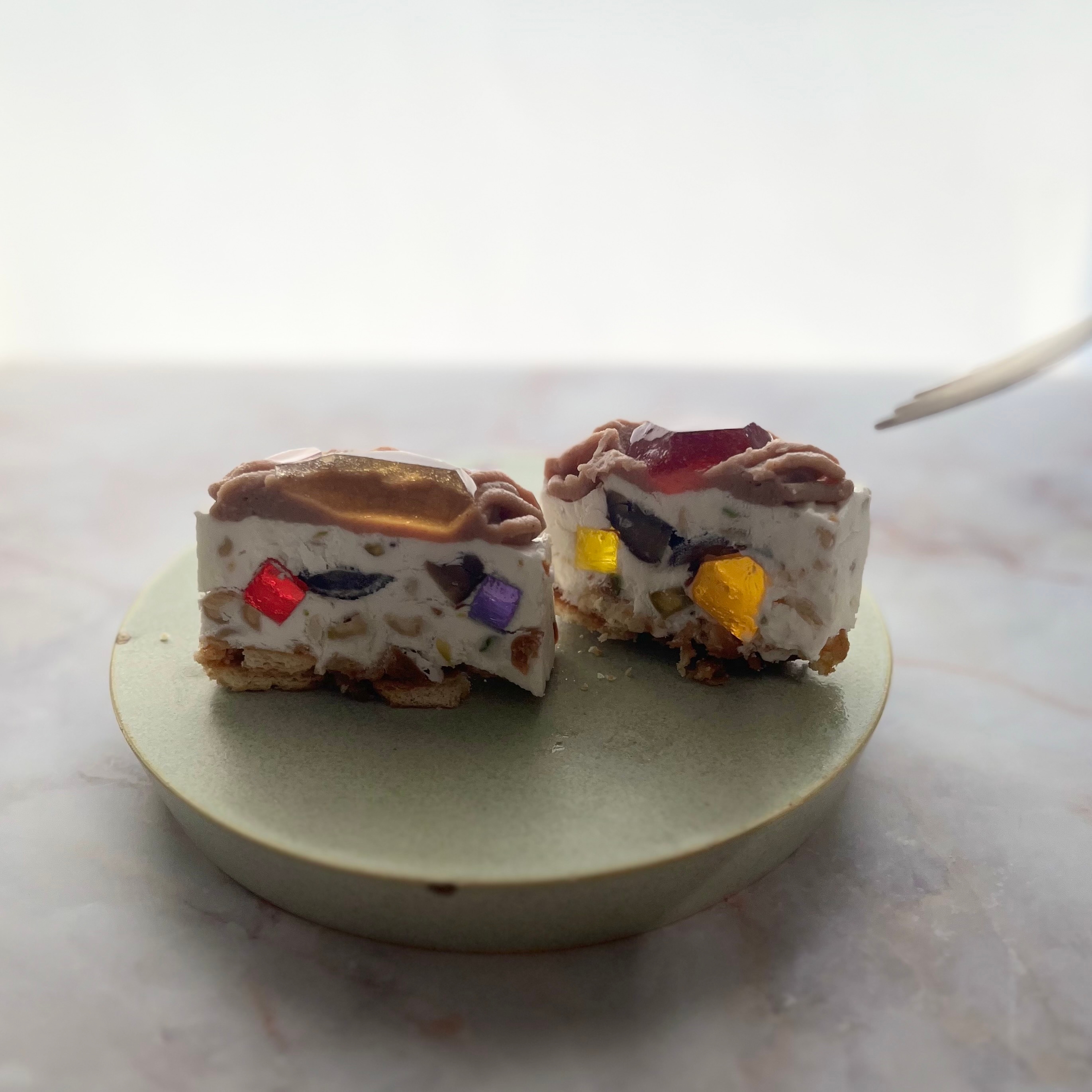 宝石のカッサータはその美しさもさることながら、リコッタチーズや、確かな原料から作られるオーム乳業の純生クリームを使用し、琥珀糖の優しい甘み、ラズベリーやオレンジピールの凝縮された甘酸っぱい味のアクセント、口の中で弾けるナッツの食感をクリームと一緒に楽しめる新感覚スイーツです。