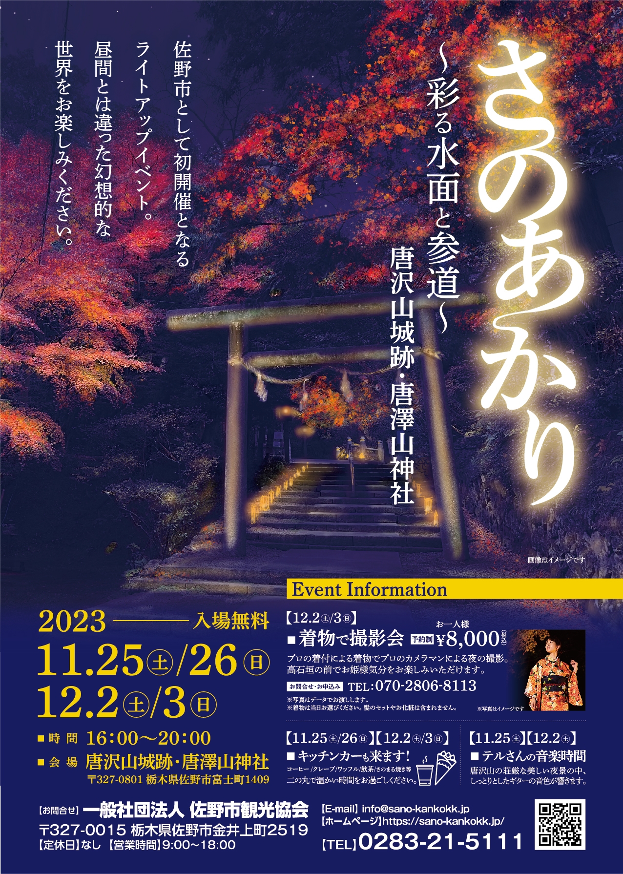 今までにない夜の観光として、佐野市の観光名所「出流原弁天池・磯山弁財天」及び「唐沢山城跡・唐澤山神社」をライトアップいたします。普段とは異なる幻想的な世界をお楽しみください。