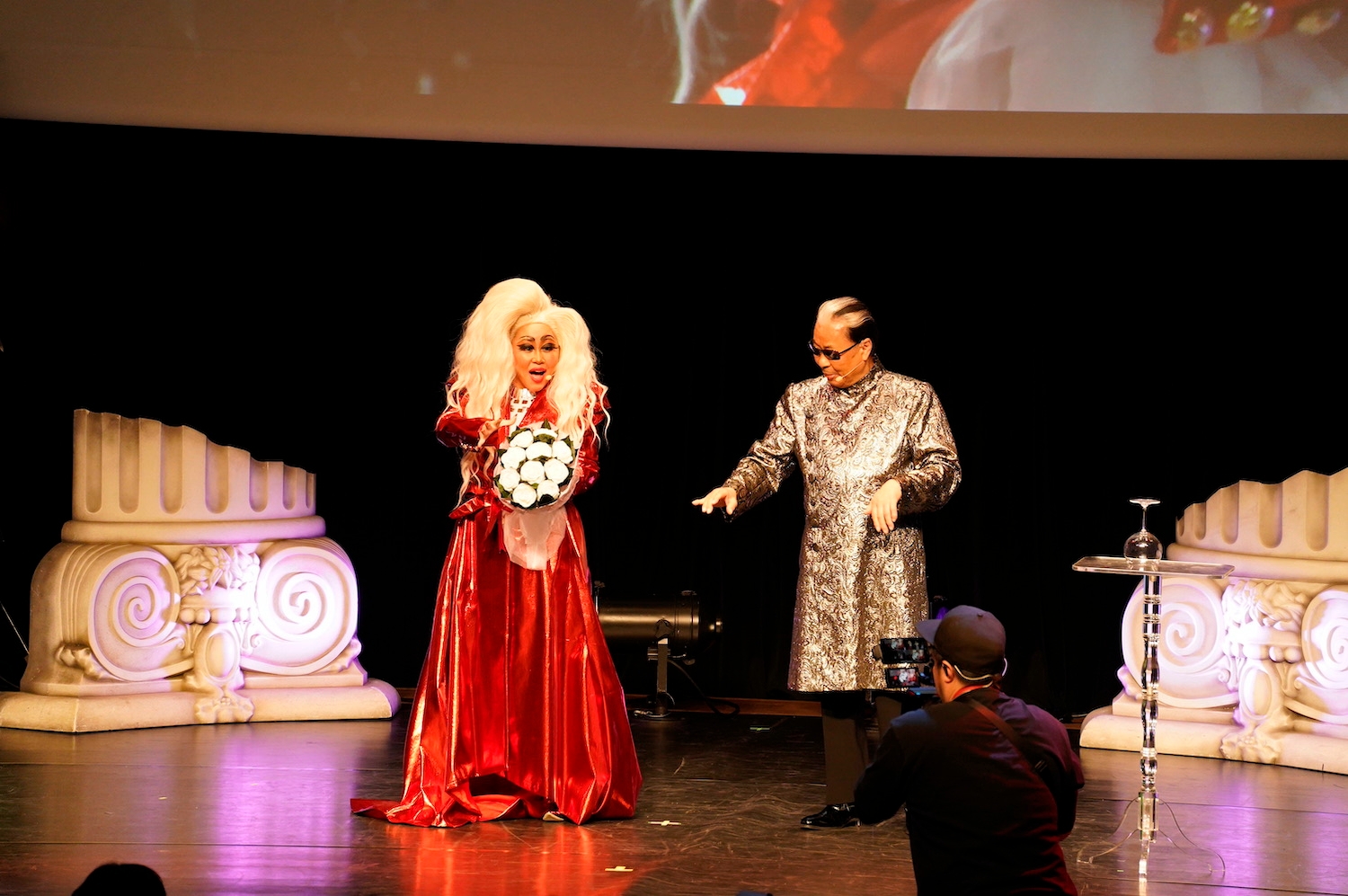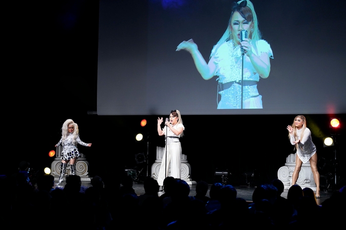 「超魔術団」と冠したこのショーはそれだけでは終わらない。「超魔術の極意」の合間には、LUNAとサマンサ・アナンサ、枝豆順子による「D3」の華やかなパフォーマンスも。簡単な振り付けを観客にレクチャーした3人は、客席に降りて会場を盛り上げながら、歌って踊って楽しませた。