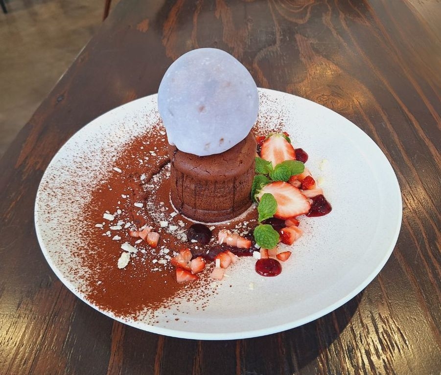 温かいフォンダンショコラの上に、求肥で包んだ濃厚なチョコアイスを乗せ、アクセントとしてハスカップソースを加えました。ハスカップの爽やかな酸味が絶妙なバランスで味わいを引き立てる、スノードームをイメージしたデザートです。