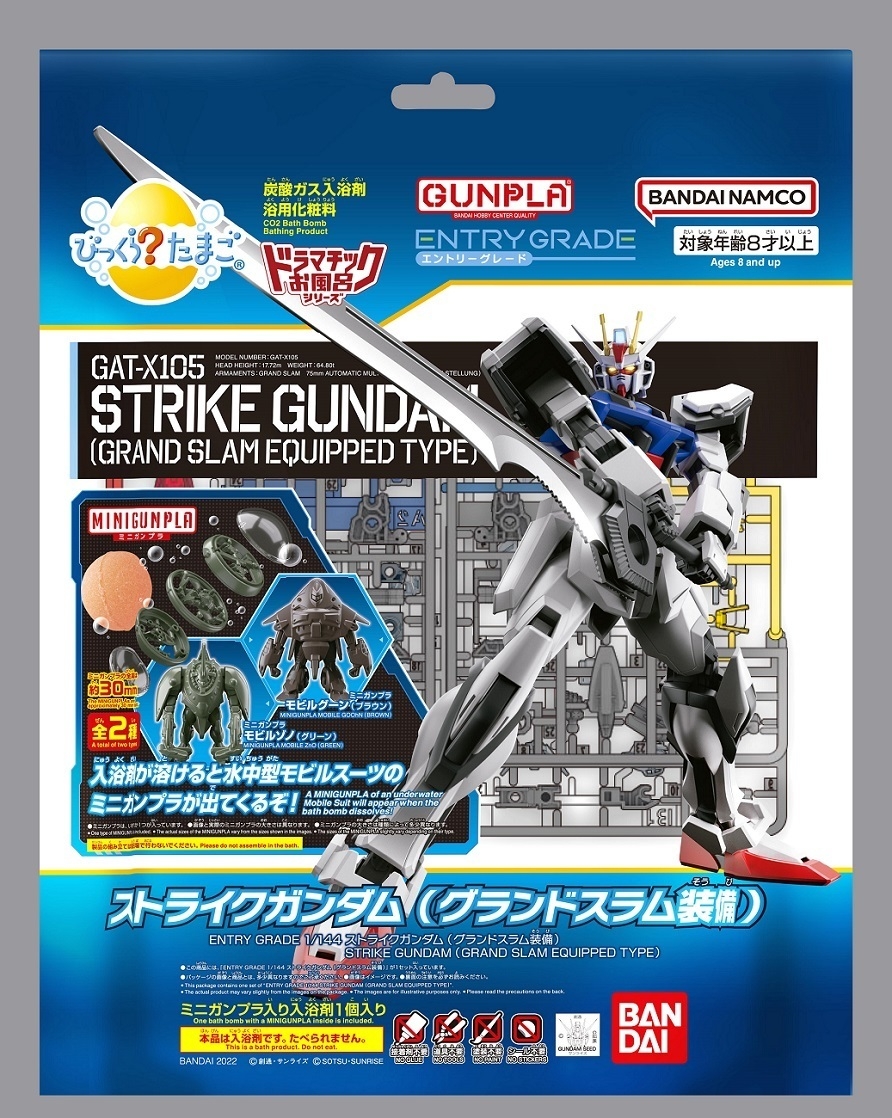 その第一弾として、同じく20周年を迎える『機動戦士ガンダムSEED』の「ガンプラ※1」とのコラボレーションである「びっくらたまご ドラマチックお風呂シリーズ GUNPLA ENTRY GRADE 1/144 ストライクガンダム & miniガンプラ モビルグーン/モビルゾノ 2種」(各1,540円 税込)を全国の量販店の日用品売場・ドラッグストア・家電量販店の日用品売場にて2022年7月11日(月)に販売開始いたします。(発売元:株式会社バンダイ)