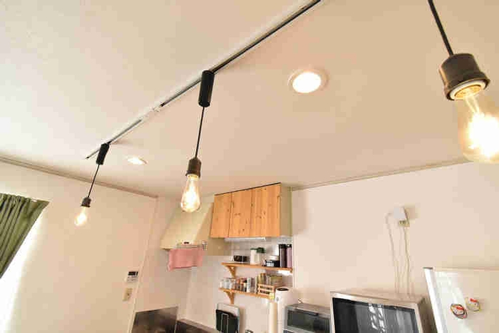 また、LDKに備えづけられているLEDダウンライトが、思っていた以上に明るく、キッチン側にあるダウンライト2基+キッチンにあるLED蛍光灯だけで十分。