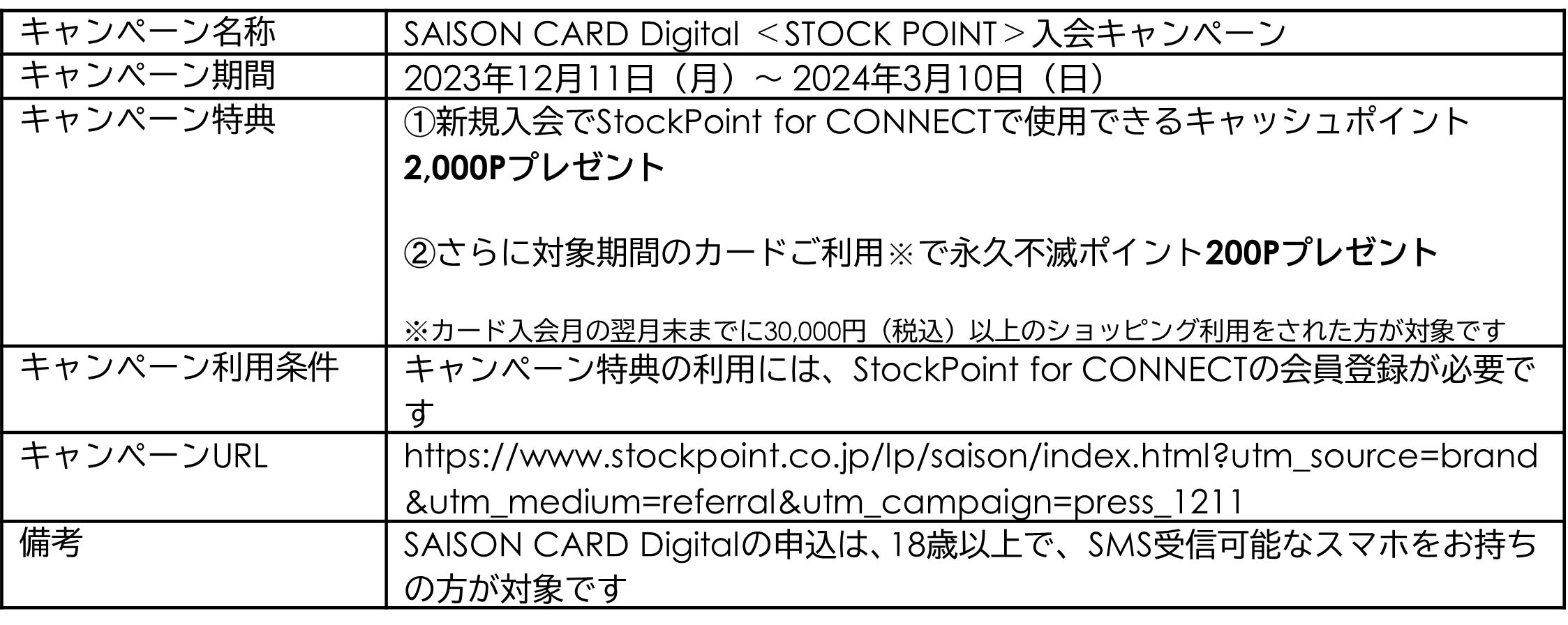 本キャンペーンで、SAISON CARD Digitalをお申込みいただくと、StockPoint for CONNECTで利用できるキャッシュポイントをプレゼントいたしますので、今まで提携ポイントを保有しておらずポイント運用をご利用いただけなかった方も体験して頂くことが可能となります。