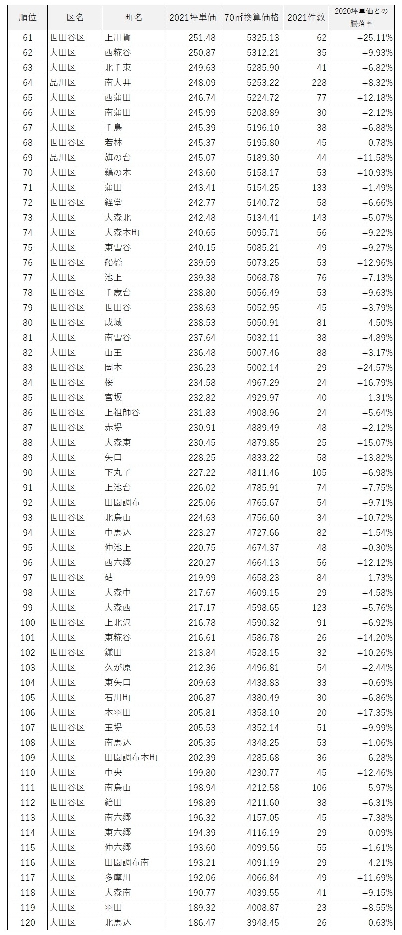 ・ランキング対象の全120町名のうち、前年より価格が上昇した町名は104ヶ所。約87%の町名で、コロナ禍でも価格上昇した2020年より、さらに坪単価が上昇している。