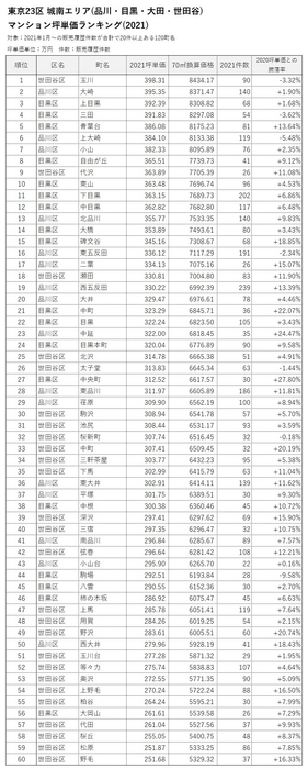 ・「世田谷区玉川」以外の上位では、山手線沿線などエリア内でも都心に近い町名が目立った。
