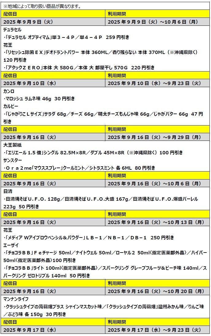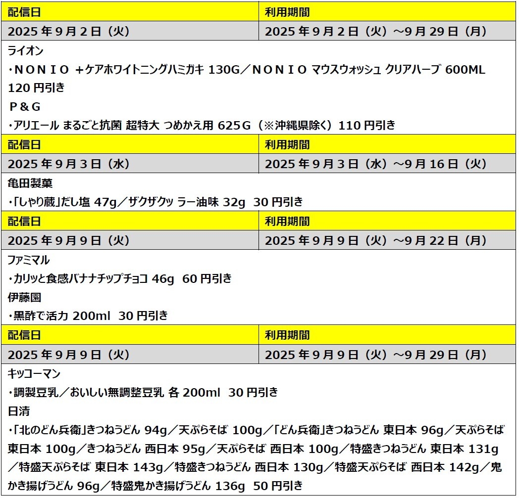 9月のファミペイは、お菓子やカップ麺、冷凍食品などの加工食品のほか、洗剤やトイレットペーパーなどの日用品など生活に欠かせない商品のクーポンを順次配信いたします。