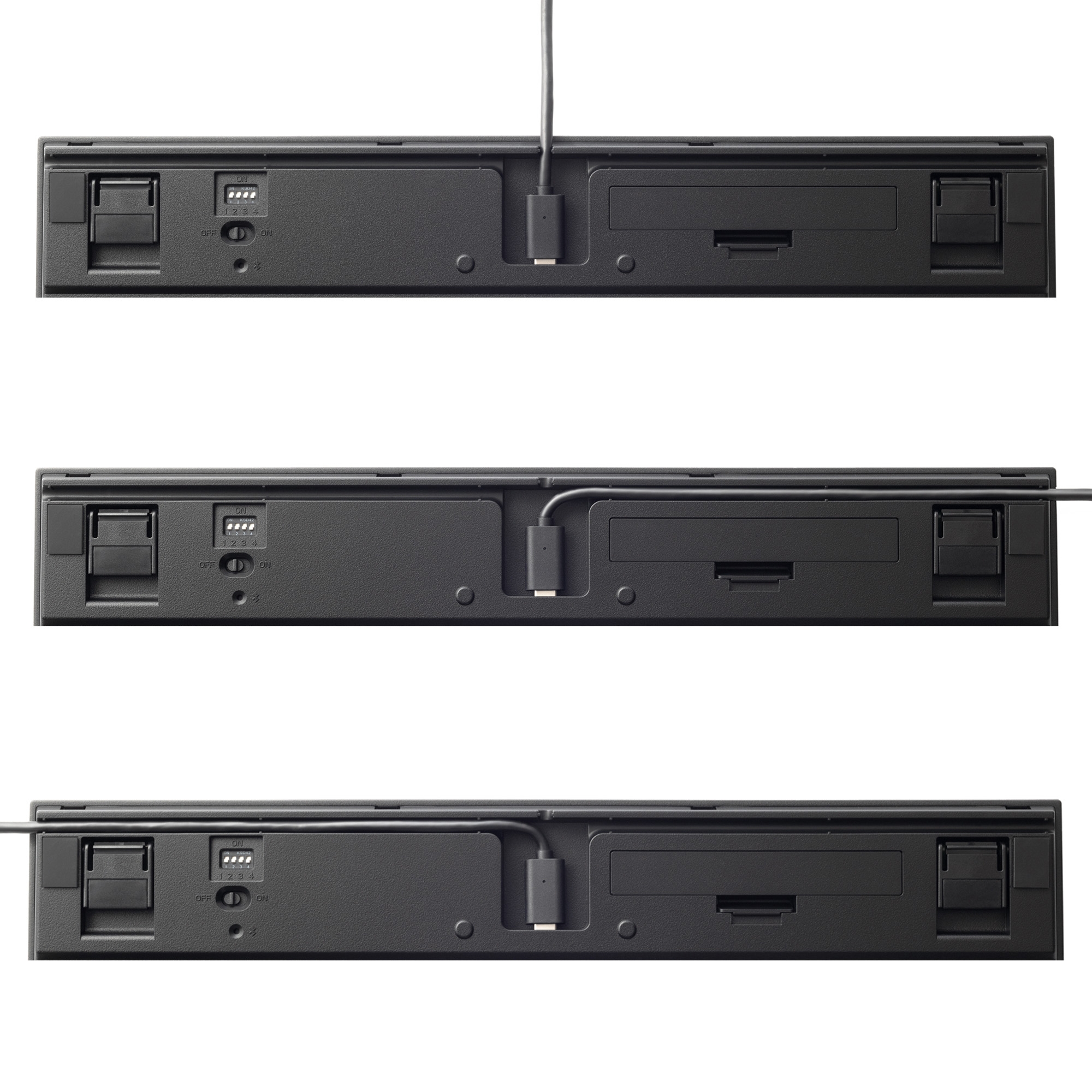 USBケーブルでの有線接続の際の、机上でのケーブル取り回しの煩わしさを解消するため、底面にケーブルガイドを搭載し、左右両サイドと中央の3方向からケーブルを引き回すことができる設計になっています。周りのデバイスやパソコンの配置に合わせて、配線することが可能です。