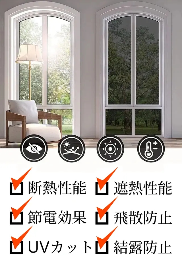 結露抑制コーティングにより窓ガラスの曇りを防ぎ、万一の地震時には飛散防止フィルムとしてガラス破片の飛散を抑制。安全性と快適性を両立します。