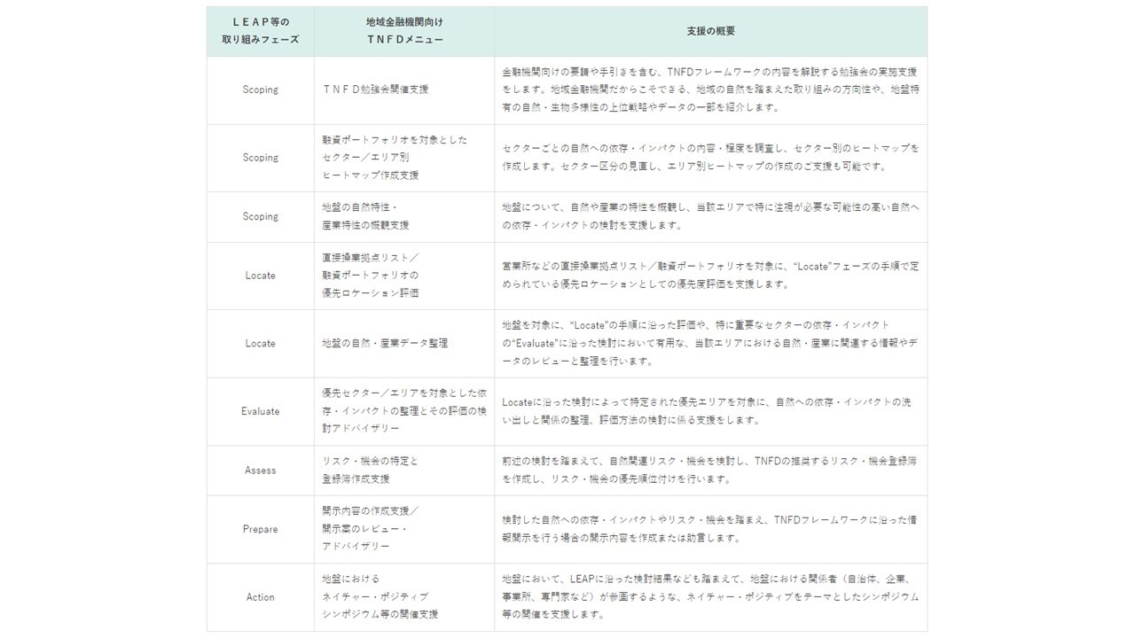 TNFDが提示している金融セクター向けガイダンスの内容も踏襲しながら、それぞれの地域金融機関およびその地盤が有する特有の性質や課題の探索、それらを踏まえた自然関連の評価・開示・アクションを支援するサービスです。地盤の自然や産業の特性に係る情報の収集とスクリーニング、その内容を踏まえた地盤において特に重要な自然資源や課題の検討や融資ポートフォリオの分析、地盤における関係者(自治体、企業、事業所、専門家など)への参画も募ってのネイチャー・ポジティブをテーマとしたシンポジウム等の開催など、それぞれの地域金融機関の取り組み状況やニーズに応じた支援が可能です。
