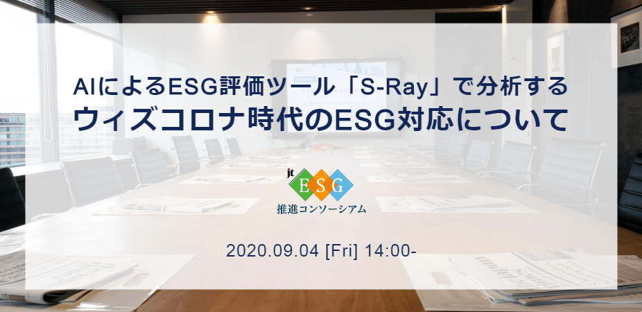 Japan Times ESG推進コンソーシアムでは、2020年9月4日(金)に参加費無料のセミナー『AIによるESG評価ツール「S-Ray」で分析する、ウィズコロナ時代のESG対応について』をオンライン形式にて開催します。