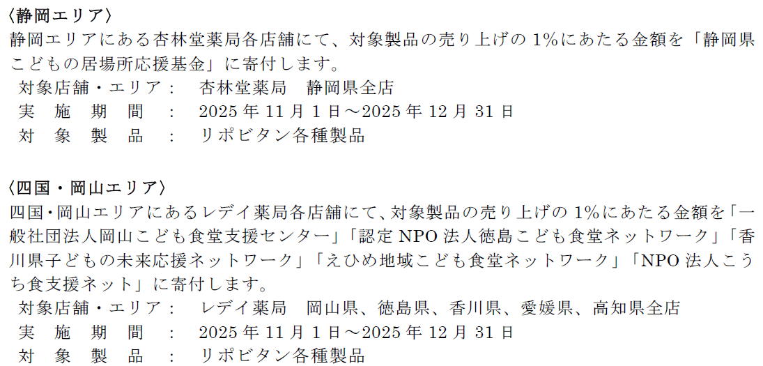 2024年のプロジェクトでは、北海道・青森県・岩手県・宮城県・秋田県・山形県・福島県・新潟県のツルハドラッグ各店舗、鳥取県・島根県・広島県・山口県のウォンツおよびドラッグストアウェルネス各店舗、静岡県の杏林堂薬局各店舗、岡山県・徳島県・香川県・愛媛県・高知県のレデイ薬局にて、リポビタン各種製品をお買い上げいただいた金額の1%にあたる3,270,873円を、各地域のこども食堂ネットワークや関連団体に寄付しました。