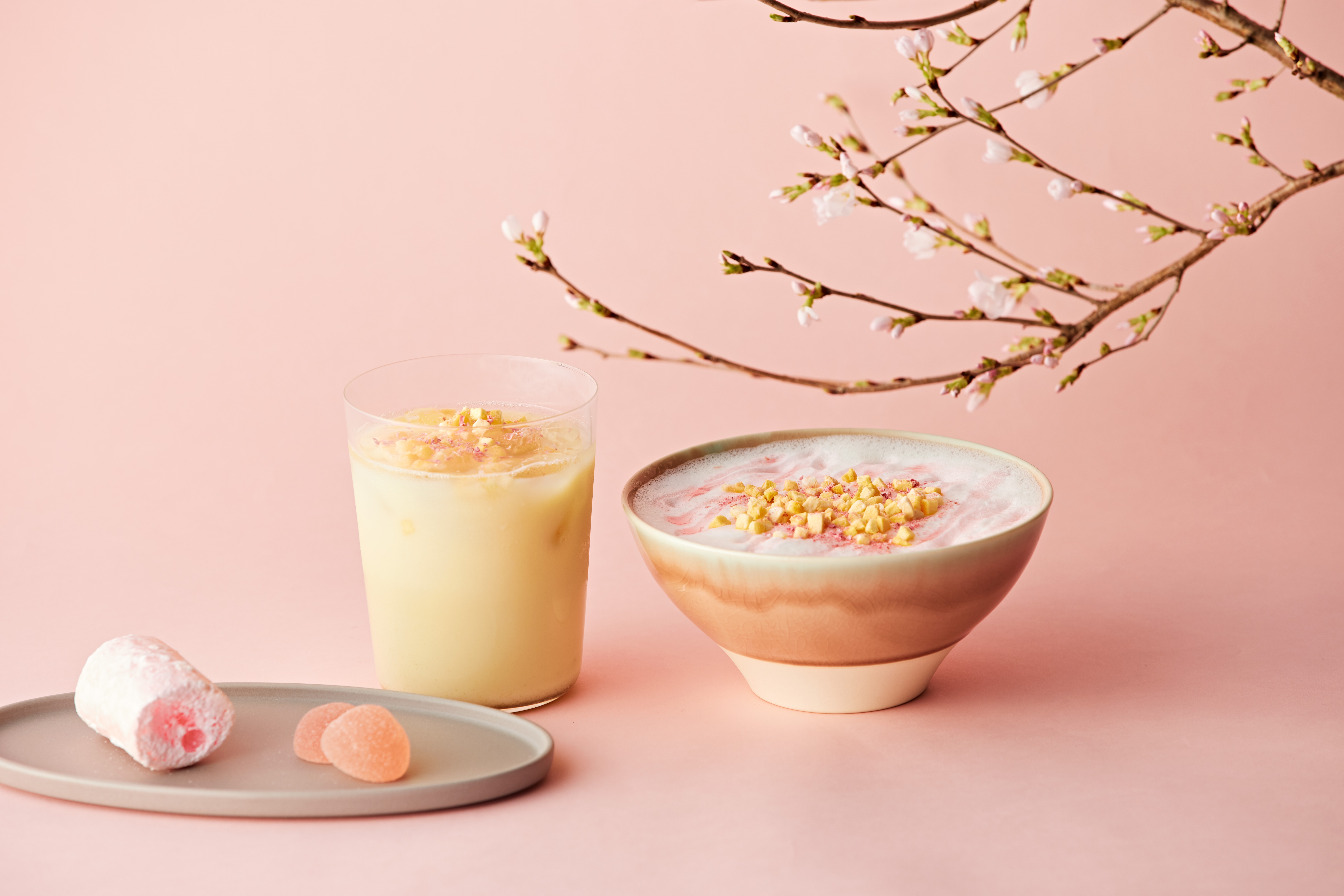 華やかな香りとすっきりとした渋みが楽しめるジャスミン茶葉を使用し、春に咲く「さくら」と「桃」をトッピングしました。優しい甘さ、ほんのりと広がるジャスミンとさくらの香りから、春を感じるミルクティーです。