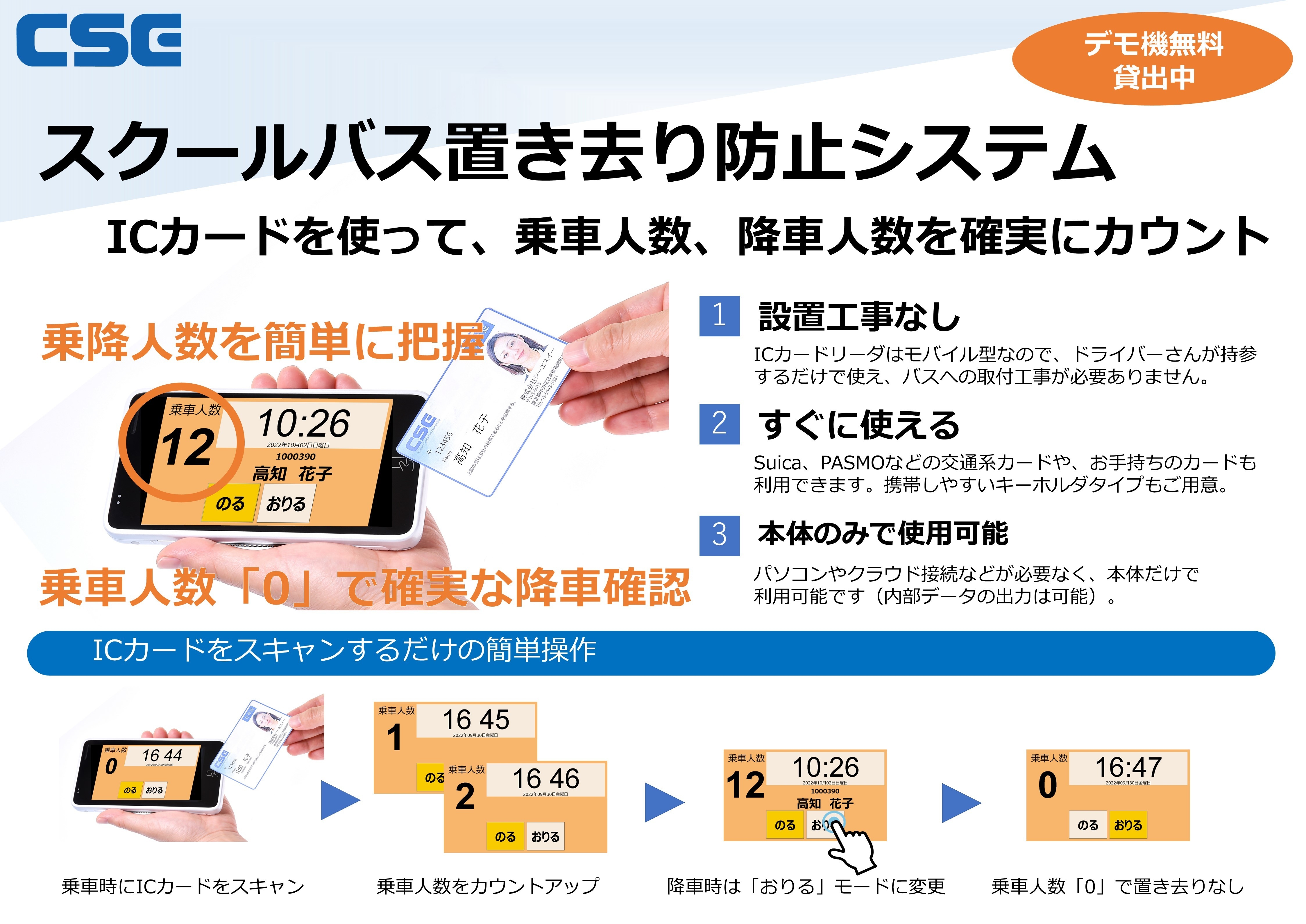 ●クラウド接続やPCなどの必要がなく、端末だけで乗降人数の確認ができ、お届き次第すぐに利用できます。