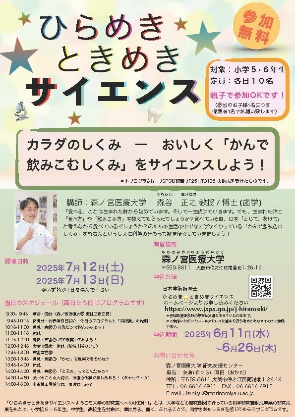 森ノ宮医療大学(学長:青木元邦、大阪市住之江区)は7月5日(土)、6日(日)および7月12日(土)、13日(日)に小学校5・6年生を対象とした「ひらめき☆ときめきサイエンス~ようこそ大学の研究室へ~KAKENHI」を2プログラム開催します。本学は西日本最大級の医療系総合大学として、子どもたちの「科学っておもしろい!」「科学についてもっと知りたい!」という気持ちを引き出し、さらにそこから「医療」を感じていただけるようなプログラムを実施します。