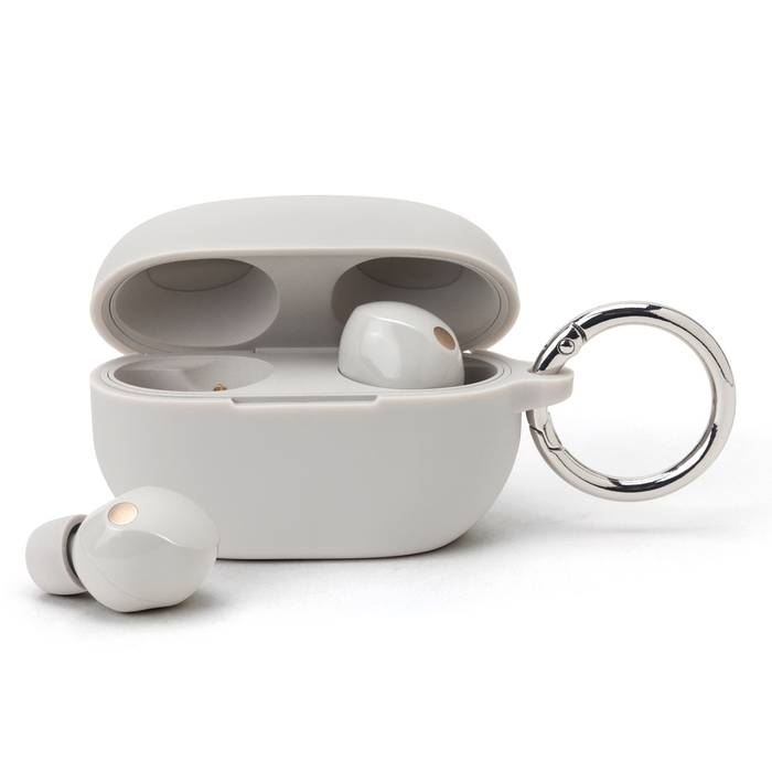柔らかなシリコン素材を使用したWF-1000XM5用 シリコンケースです。柔軟で取り付けしやすいシリコン素材でWF-1000XM5をキズから守ります。シリコン特有のベタつきを抑え肌ざわりのよいさらさらとした質感の加工を施しております。ケースを装着したままケーブルでの充電はもちろんワイヤレス充電も可能です。使い勝手の良いカラビナリング付きで持ち運びにも便利です。