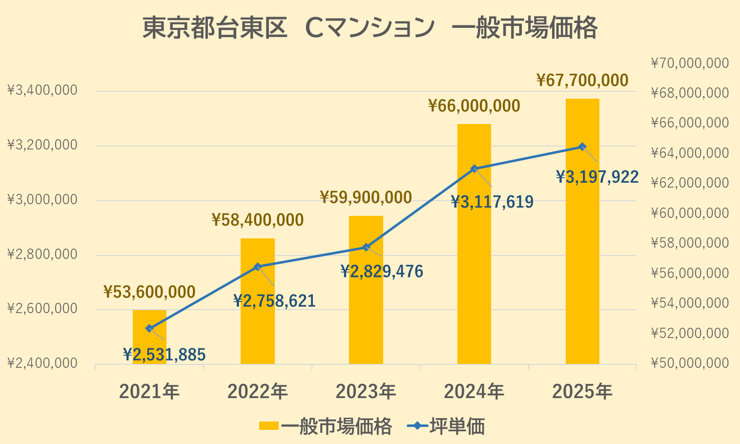 Cマンションの一般市場価格・坪単価の推移は上記【図5】の通りです。