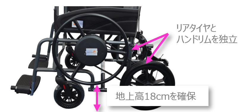 今までの課題であったハンドリムを漕いだ時にリアタイヤに手が触れて「手が汚れる」、「ウイルス感染が不安」といった不満点を解消し、衛生的でストレスの少ない移動を可能にする車椅子です。