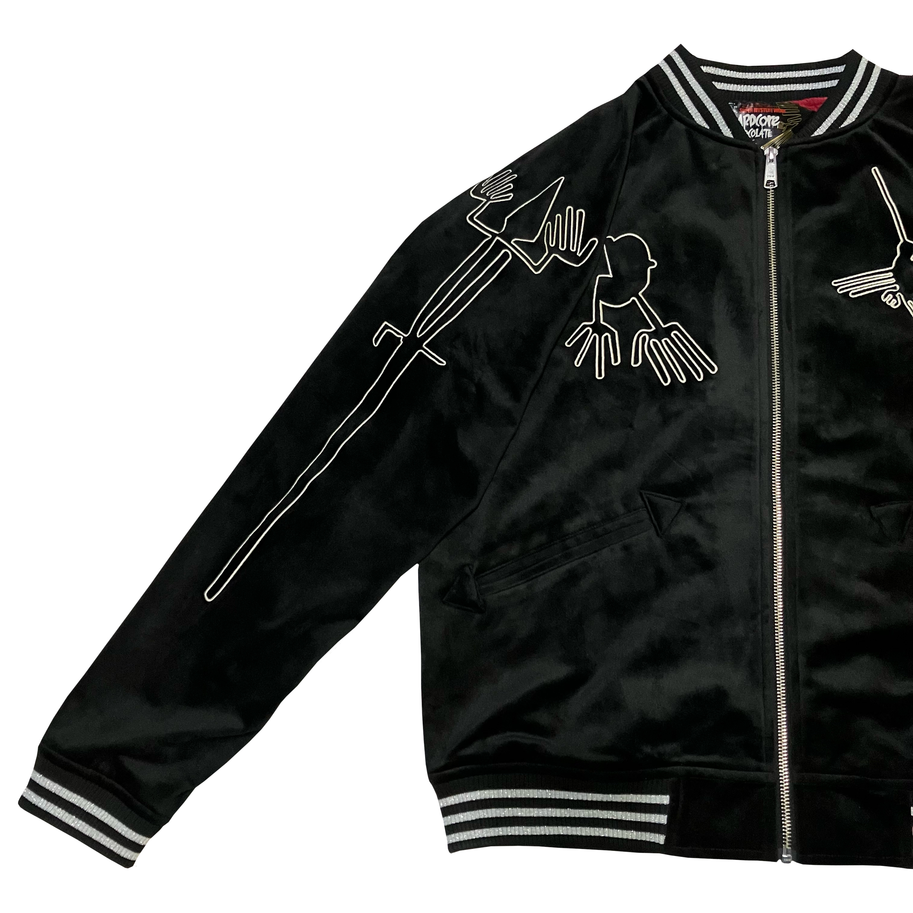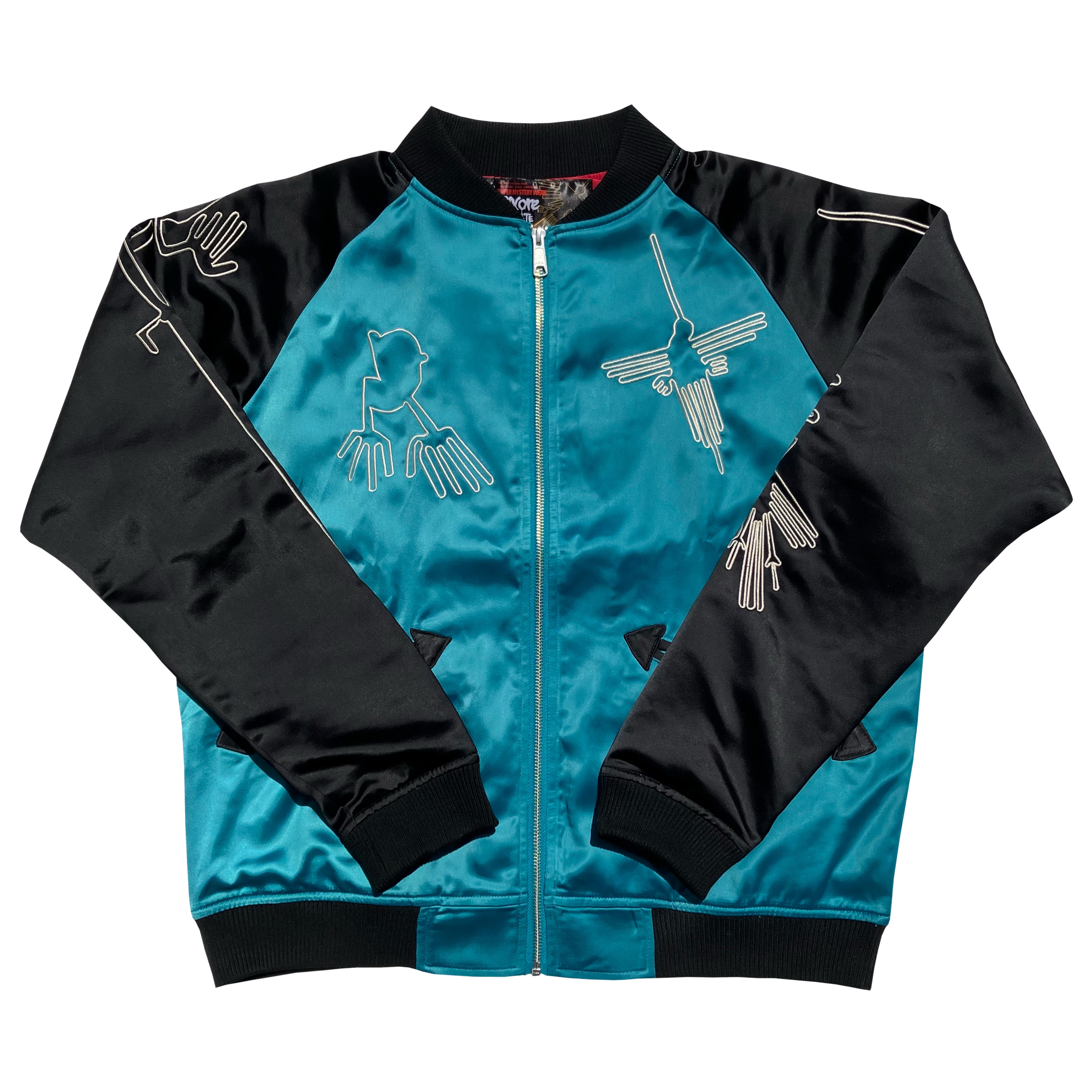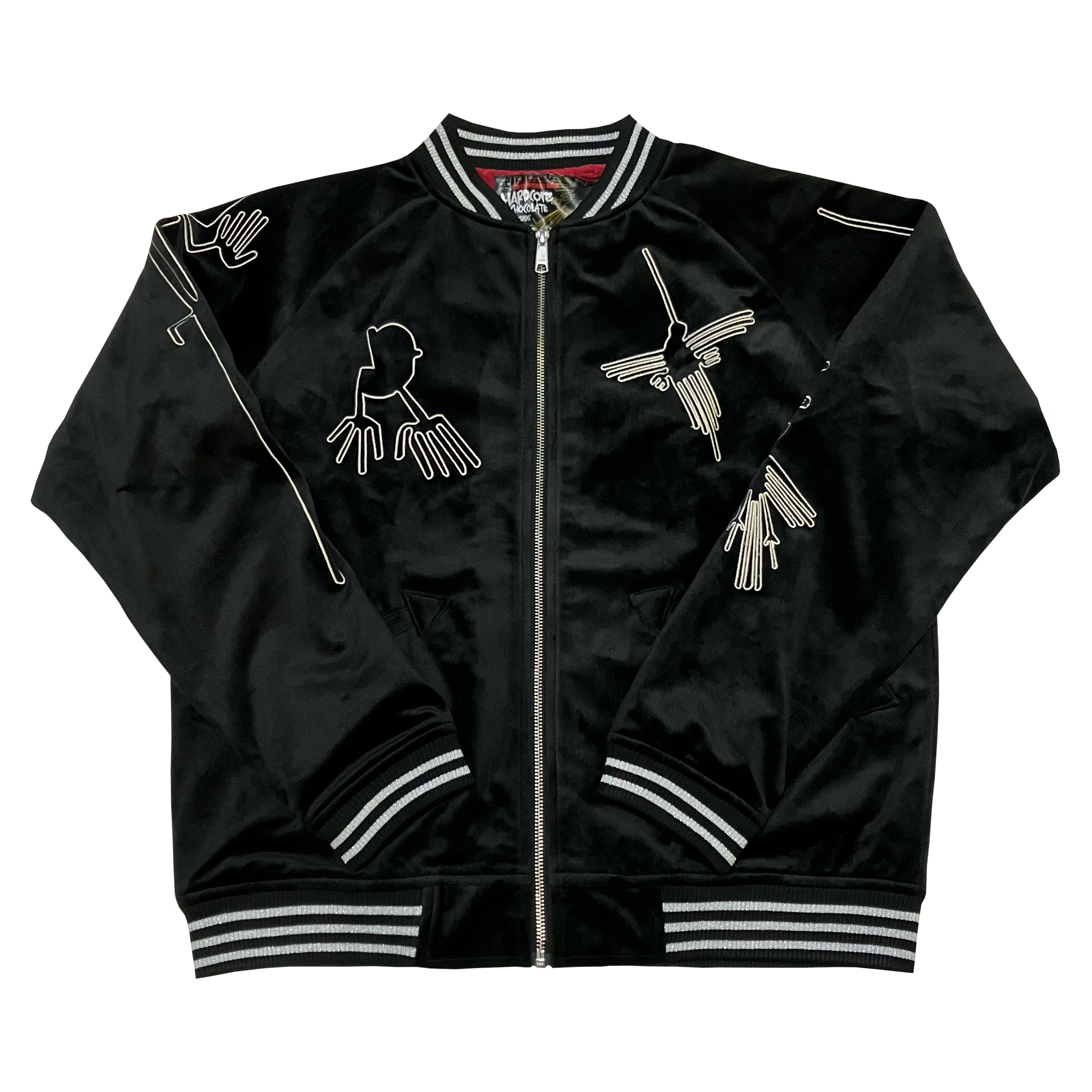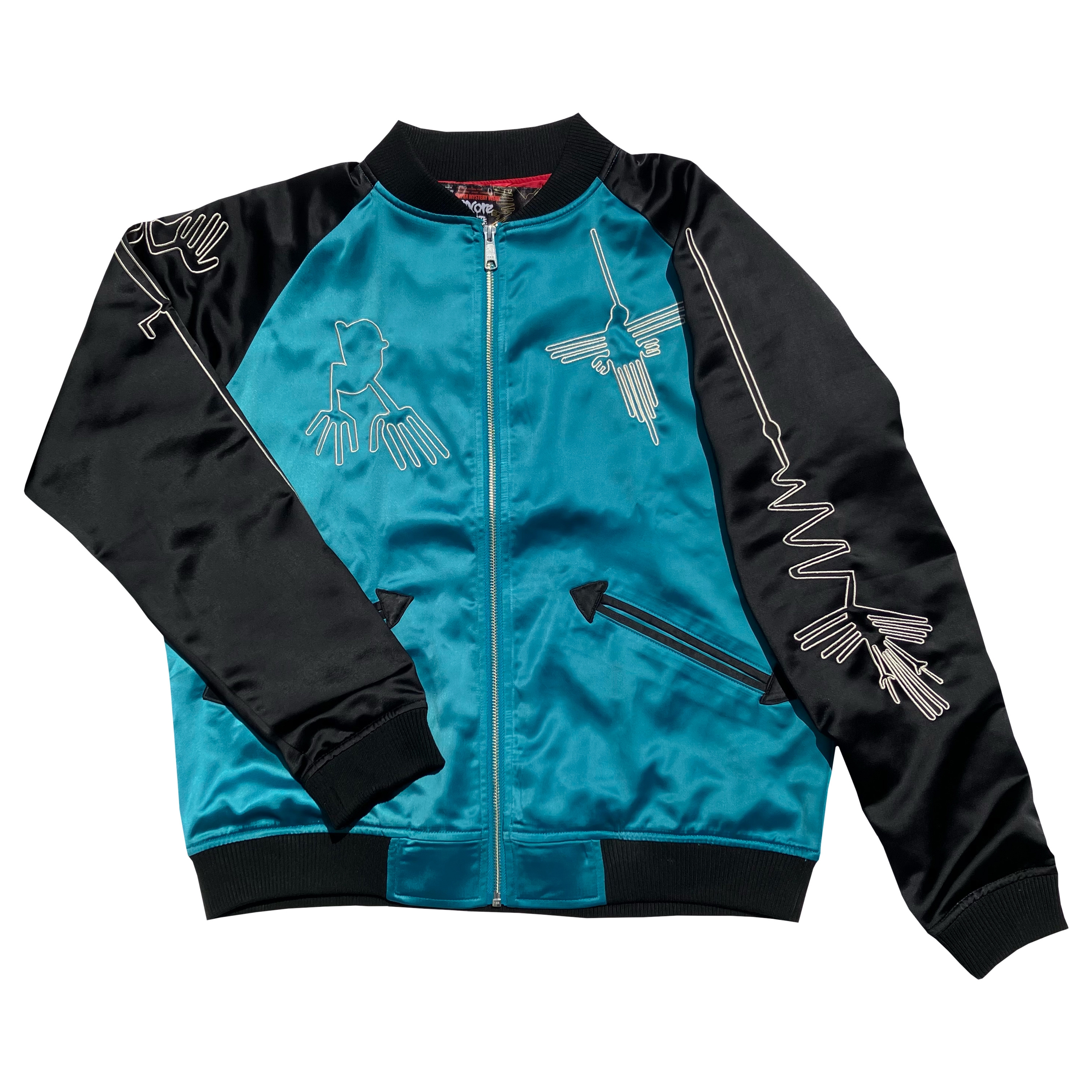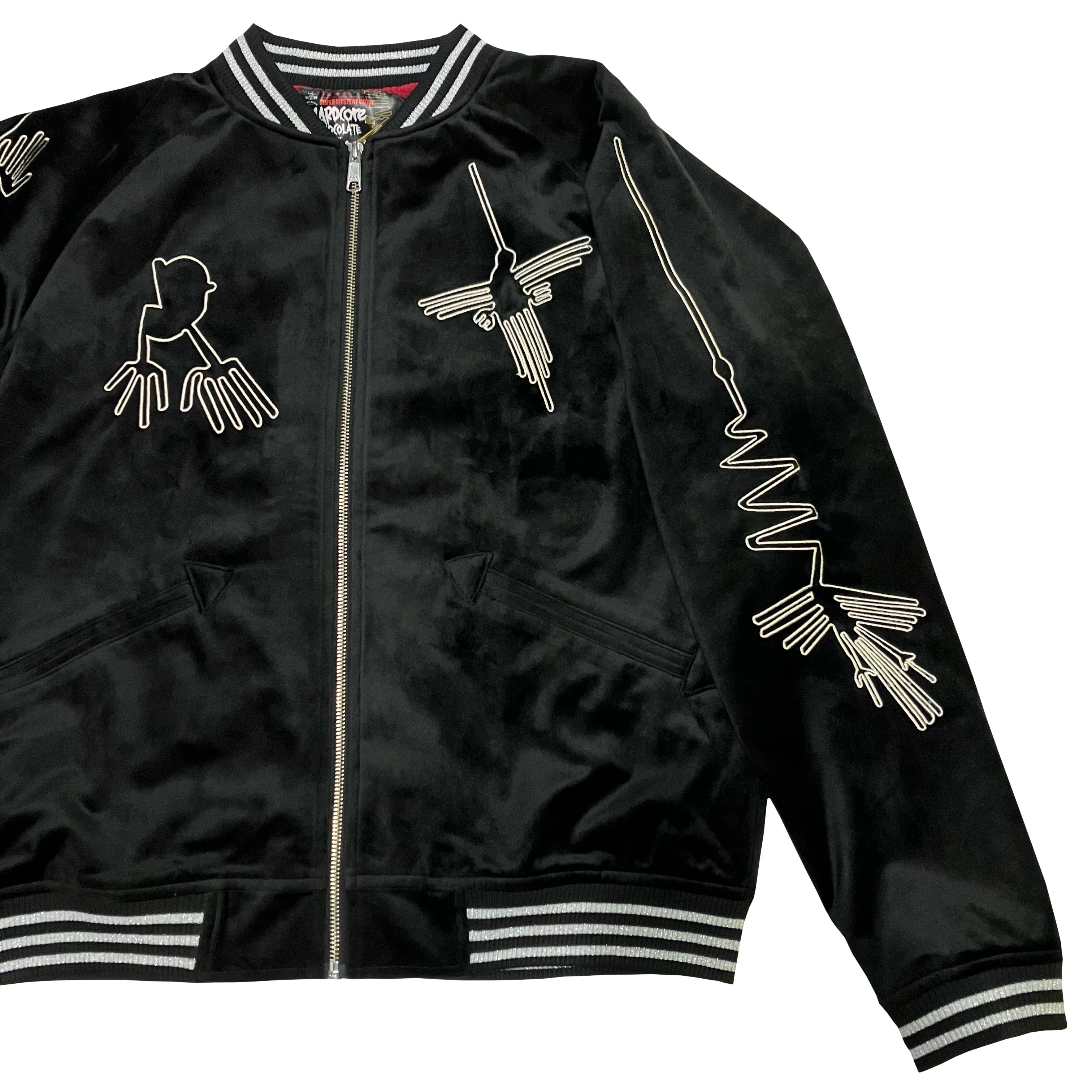 例年大好評の別珍ナスカジャン、今年は真夜中のようなメヒア・ブラックが登場!漆黒の闇の中、ギンギンギラギラナスカの地上絵のシルバー刺繍が鈍く怪しく輝く!