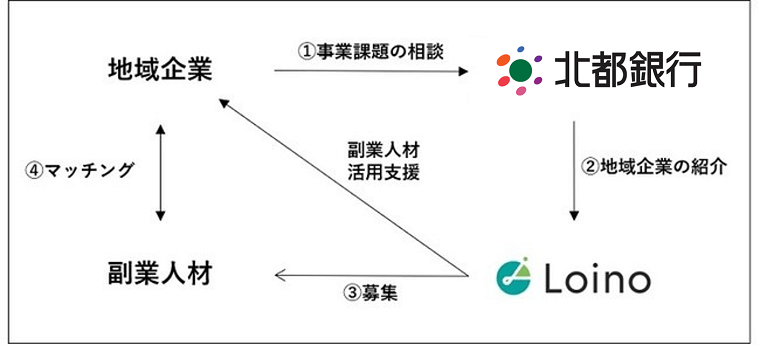 本件において北都銀行は、取引先企業の人材ニーズを見極めたうえで適切な副業人材を「Loino」を通じて紹介し、「Loino」は、副業人材と企業とのマッチングとフォローアップを行います。