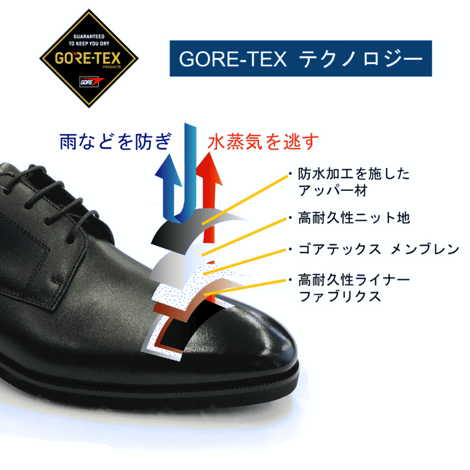 縫製部分に防水テープを貼り付けた形で組み込むことにより、甲材に雨水が染み込んでもシューズ内部には浸水しない構造になっています。