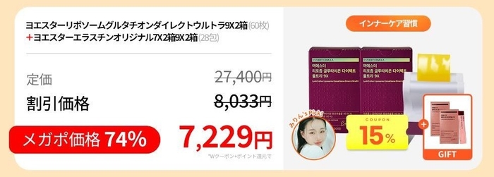 今回は、通常の2箱セットに加え、みりんさんスペシャルコラボ企画として「ヨエスターエラスチンオリジナル7X」2箱を無料で贈呈するお得なセットをご用意しました。さらに、初コラボを記念してこのセット限定の15%オフクーポンを提供中です。この機会にぜひお試しください!