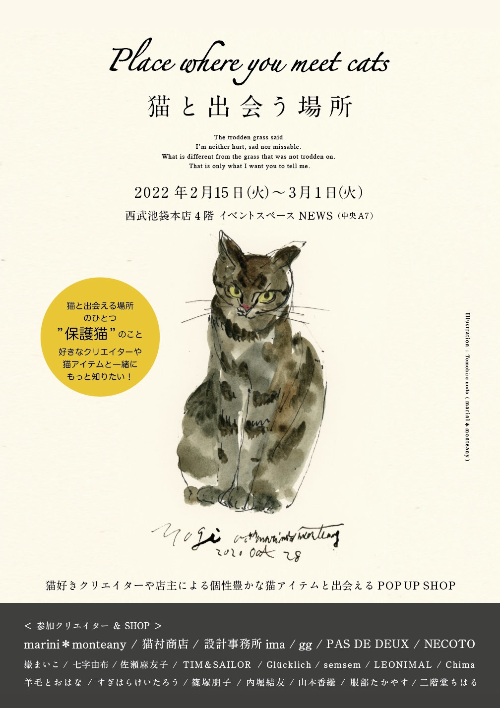 2022年2月22日は「猫の日」。猫と出会える場所はたくさんあります。そのひとつが“保護猫”や“譲渡会”。猫好きクリエイターや店主による個性豊かな猫グッズやお菓子をきっかけに、すべての命が幸せに暮らしていくためのアクションをみんなで考えてみたいと西武池袋本店NEWSが初めて試みる保護猫をテーマとしたPOP UP SHOPです。